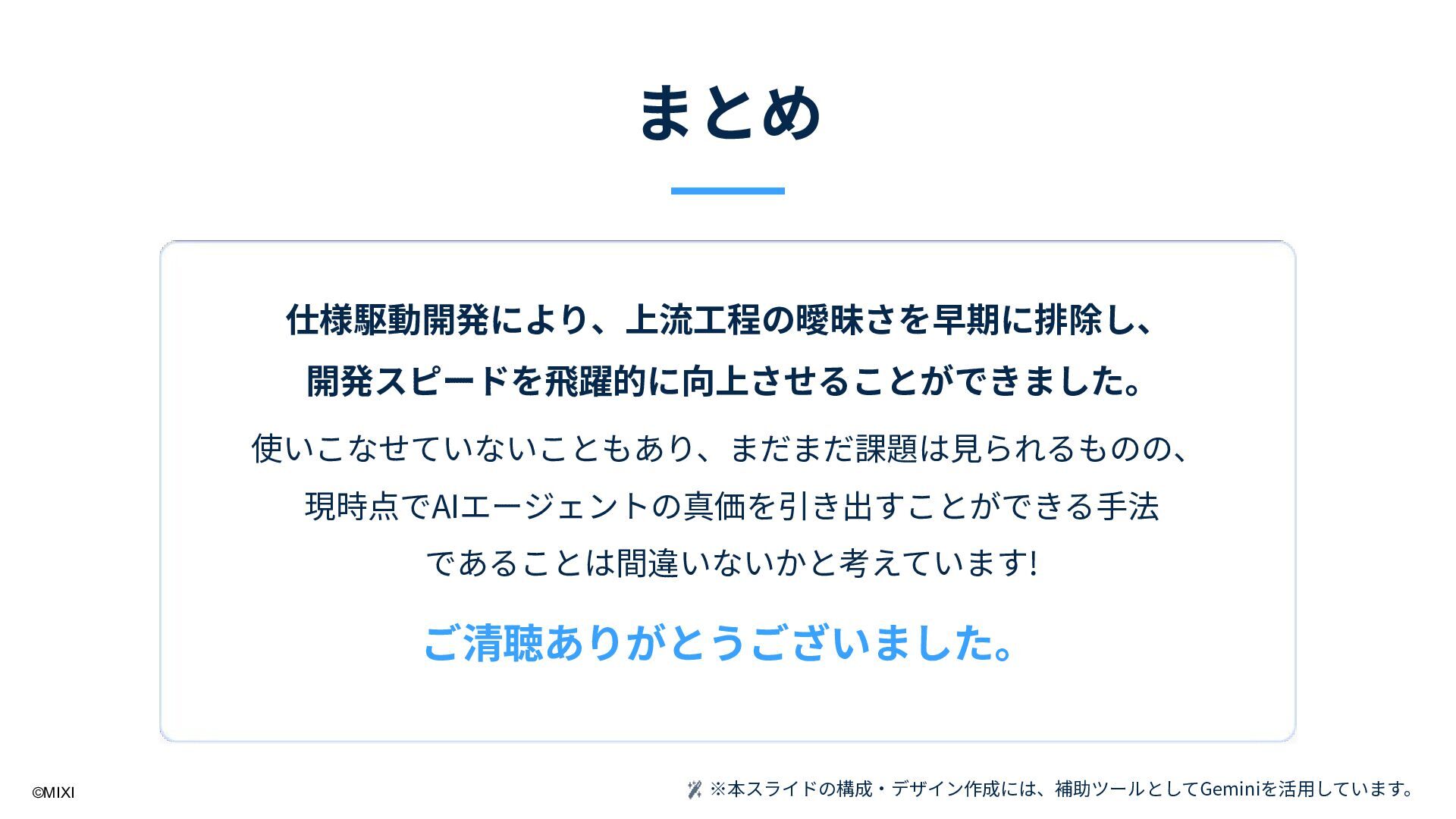 ドとして扱い、ドキュメントは別 途⽤意する「割り切り」も規模に よっては必要 圧倒的な時短効果 理想と異なる泥臭い現実は多々あ るが、結果として「開発期間を約 45%削減できた」事実は揺るぎな く、⾮常に効率的な開発⼿法だと 実感 振り返りと得られた知⾒