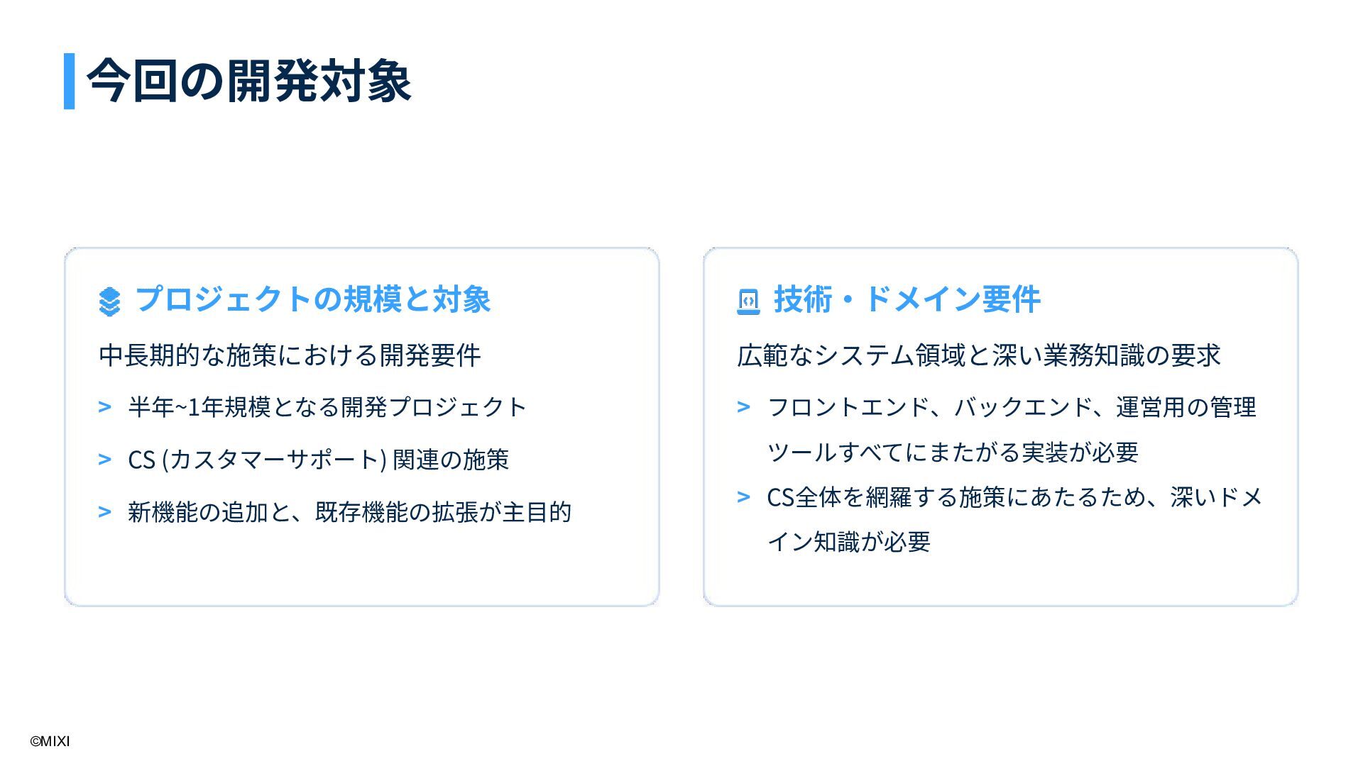 1. ©MIXI プロジェクトの規模と対象 中⻑期的な施策における開発要件 技術‧ドメイン要件 広範なシステム領域と深い業務知識の要求 半年~1年規模となる開発プロジェクト CS (カスタマーサポート) 関連の施策 新機能の追加と、既存機能の拡張が主⽬的