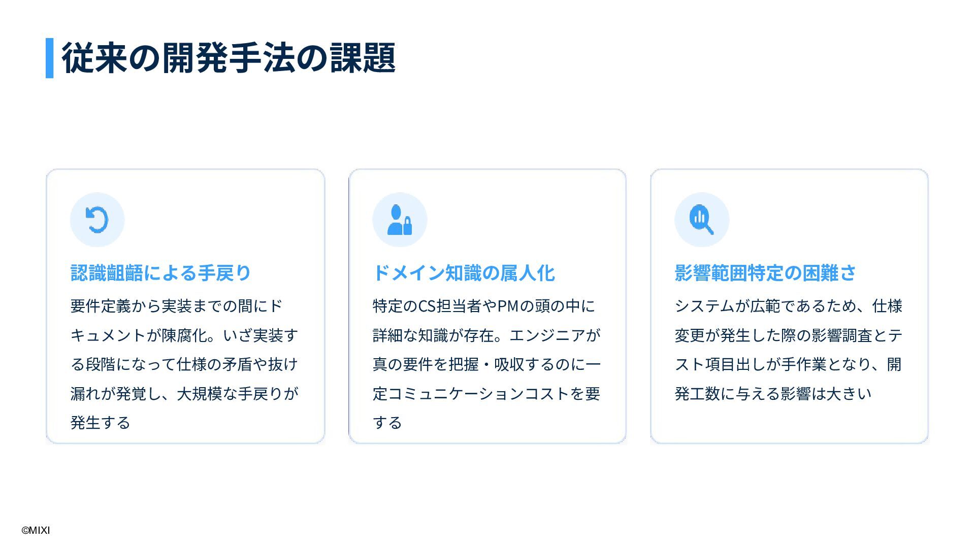 2. ©MIXI 認識齟齬による⼿戻り 要件定義から実装までの間にド キュメントが陳腐化。いざ実装す る段階になって仕様の⽭盾や抜け 漏れが発覚し、⼤規模な⼿戻りが 発⽣する ドメイン知識の属⼈化 特定のCS担当者やPMの頭の中に 詳細な知識が存在。エンジニアが