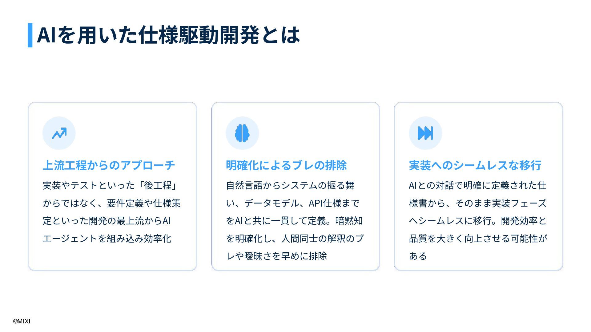 3. ©MIXI 上流⼯程からのアプローチ 実装やテストといった「後⼯程」 からではなく、要件定義や仕様策 定といった開発の最上流からAI エージェントを組み込み効率化 明確化によるブレの排除 ⾃然⾔語からシステムの振る舞 い、データモデル、API仕様まで をAIと共に⼀貫して定義。暗黙知