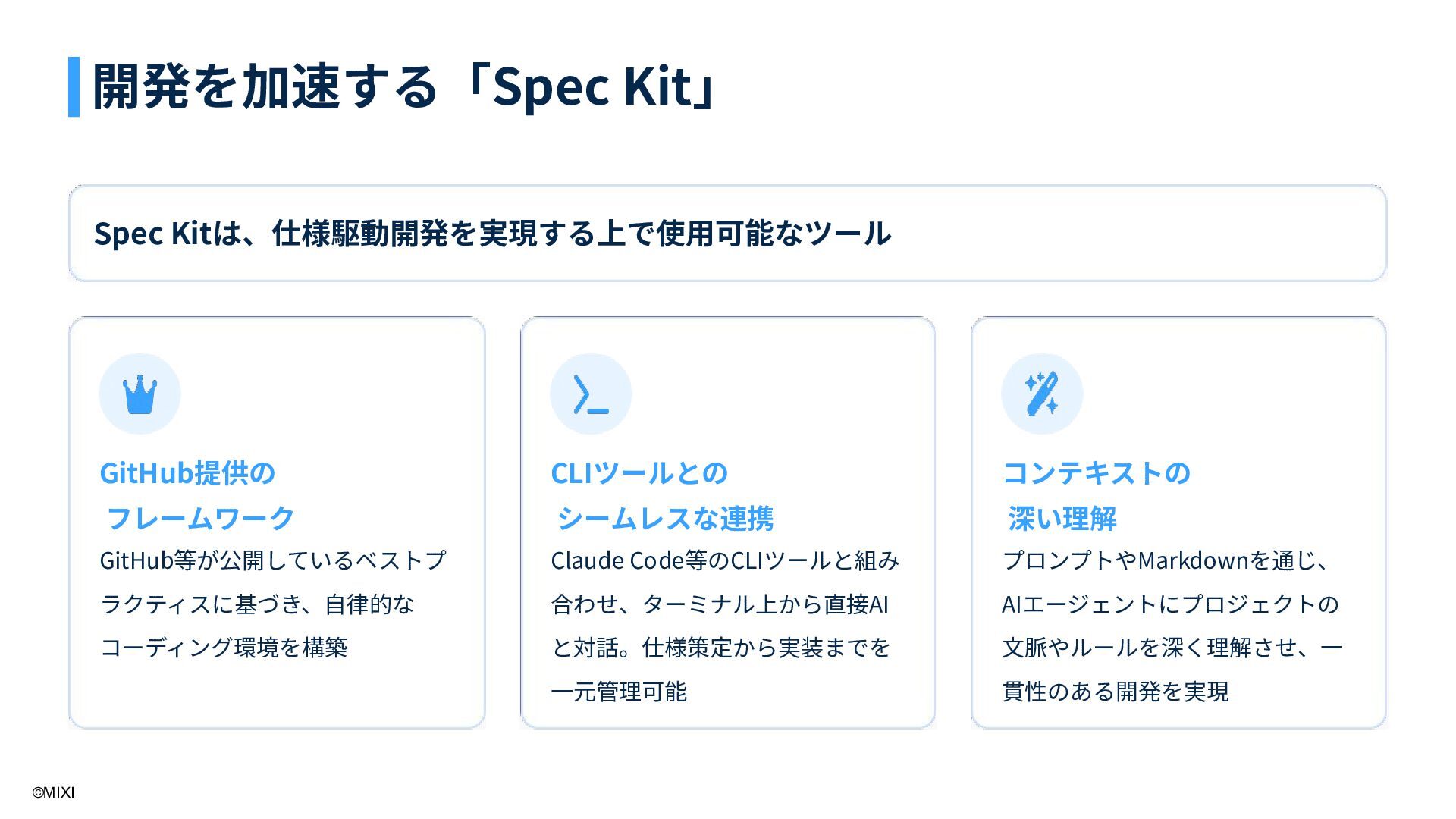 Claude Code等のCLIツールと組み 合わせ、ターミナル上から直接AI と対話。仕様策定から実装までを ⼀元管理可能 コンテキストの 深い理解 プロンプトやMarkdownを通じ、 AIエージェントにプロジェクトの ⽂脈やルールを深く理解させ、⼀ 貫性のある開発を実現 開発を加速する「Spec Kit」