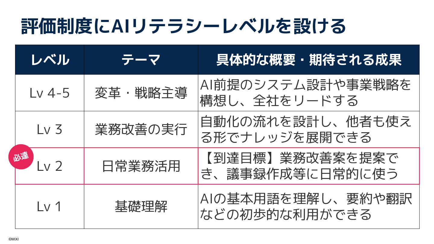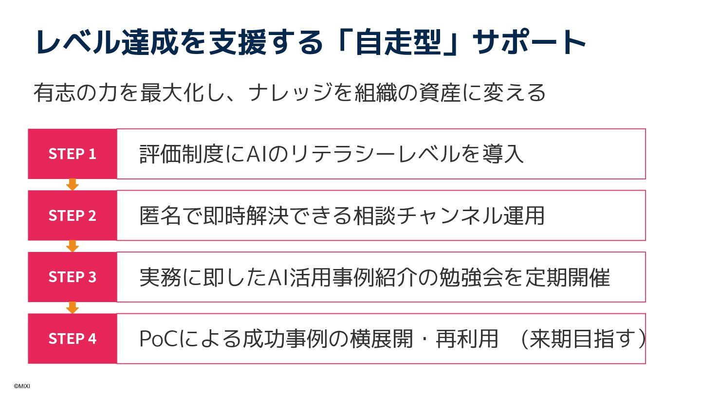 あわせてAI活用を前提にした情報整理や評価制度、勉強会を通じて組織全体のAIリテラシー向上も推進しています。