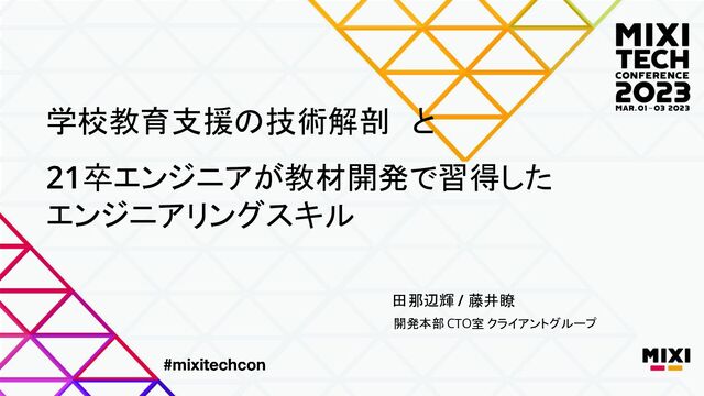 MIXI TECH CONFERENCE 2023 にてお話した田那辺と藤井の資料です。