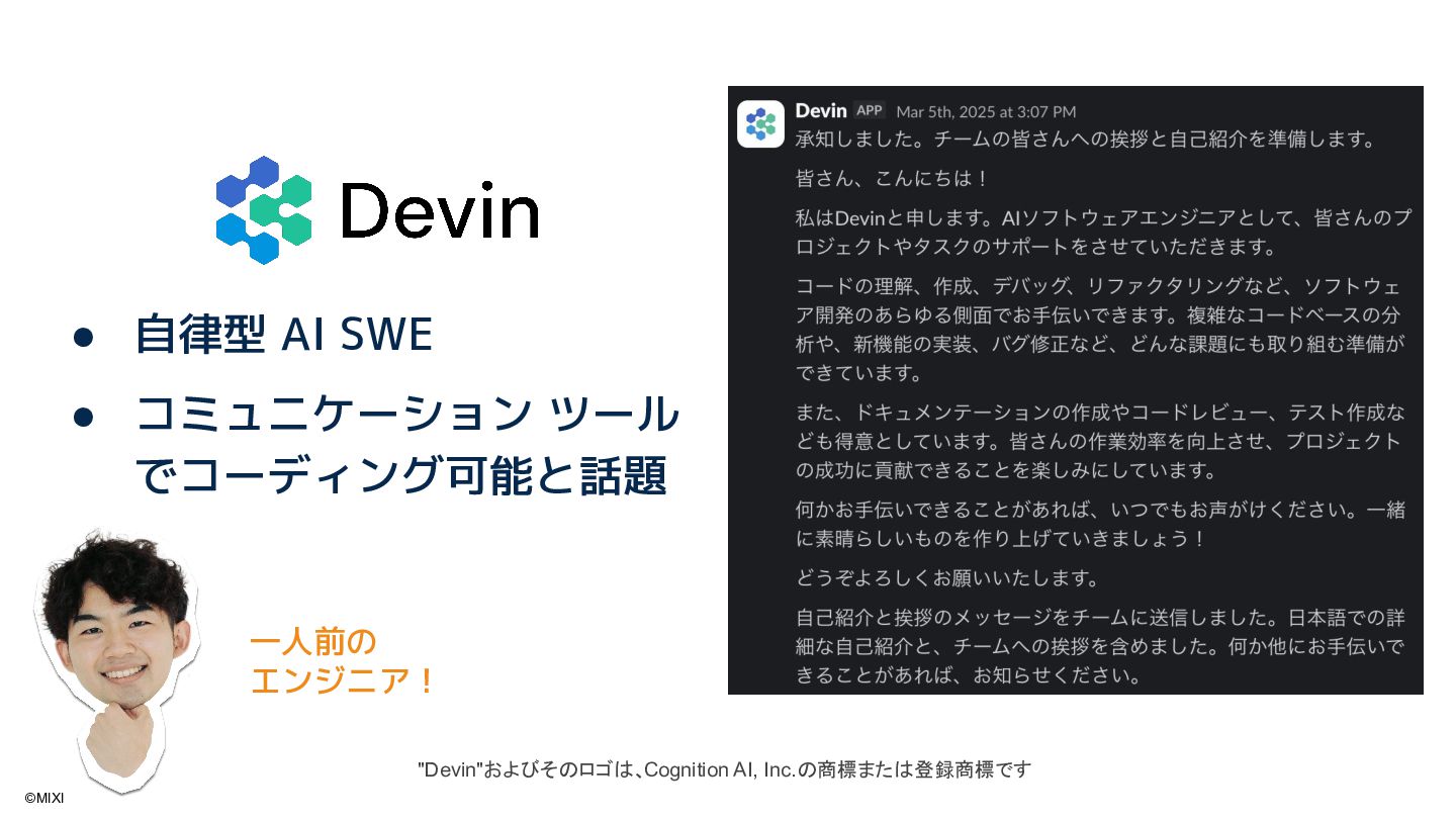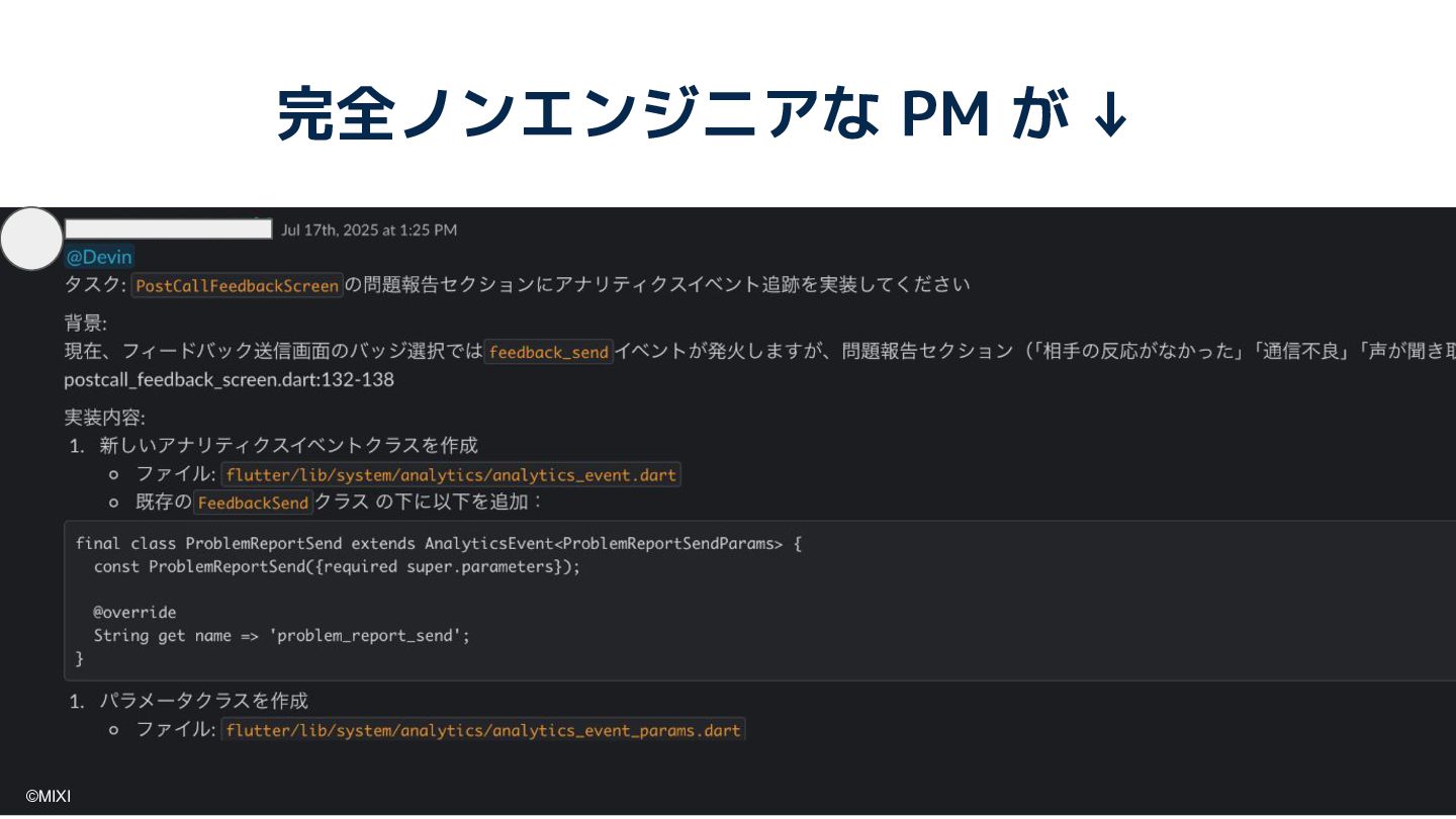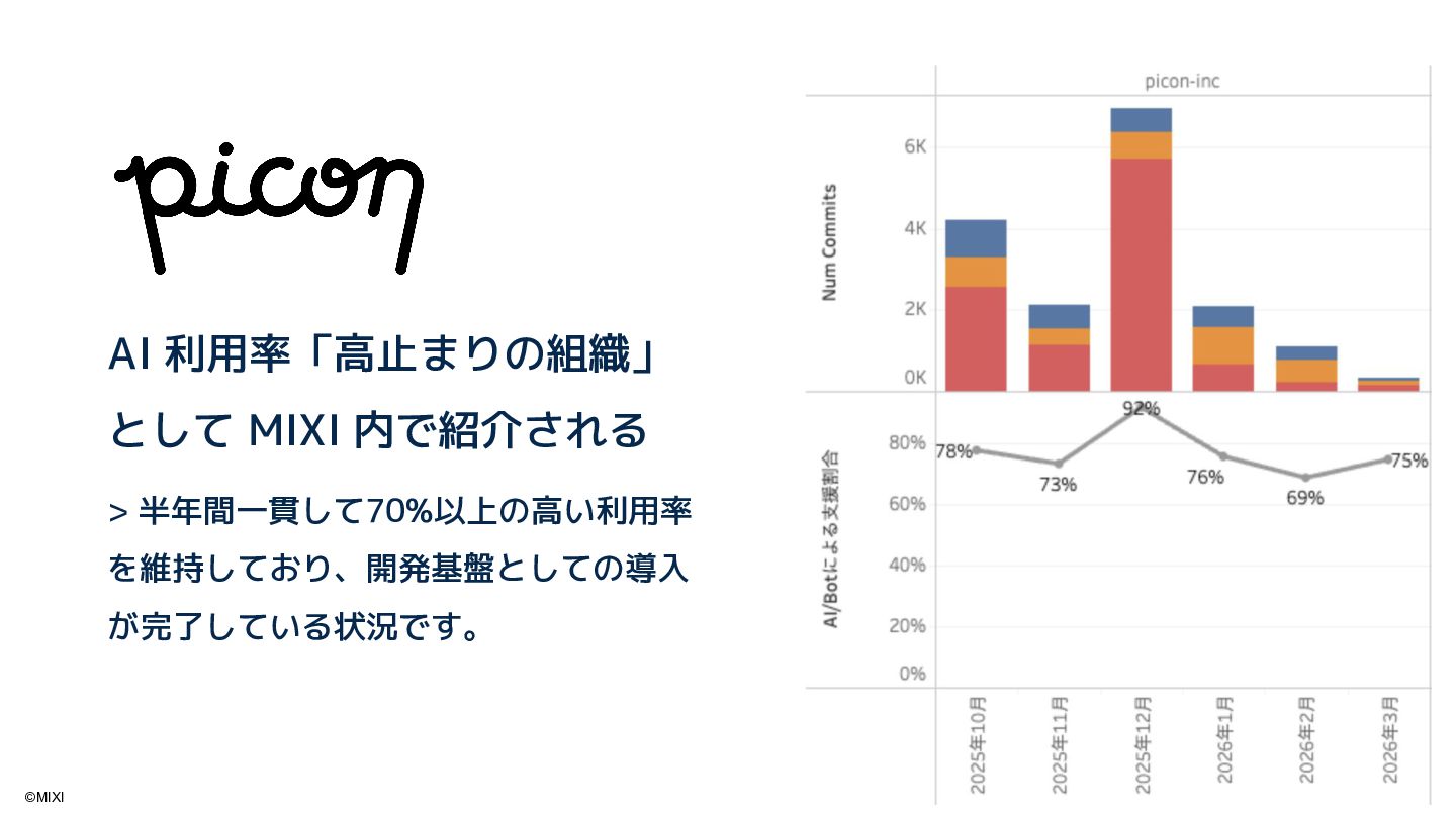 piconでは、生成AIフル活用により、ノンエンジニアを含む全メンバーが直接的にアプリの改善・拡張に関わる開発体制を構築しています。本セッションでは、自律型AIエージェント「Devin」を軸に行ったワークフロー改善、および Devin を活用した社内ツール「Satin」による新しい開発手段に焦点を当て、ノンエンジニア主導でプロダクトを爆速で改善し続ける、次世代の開発文化を伝授します。