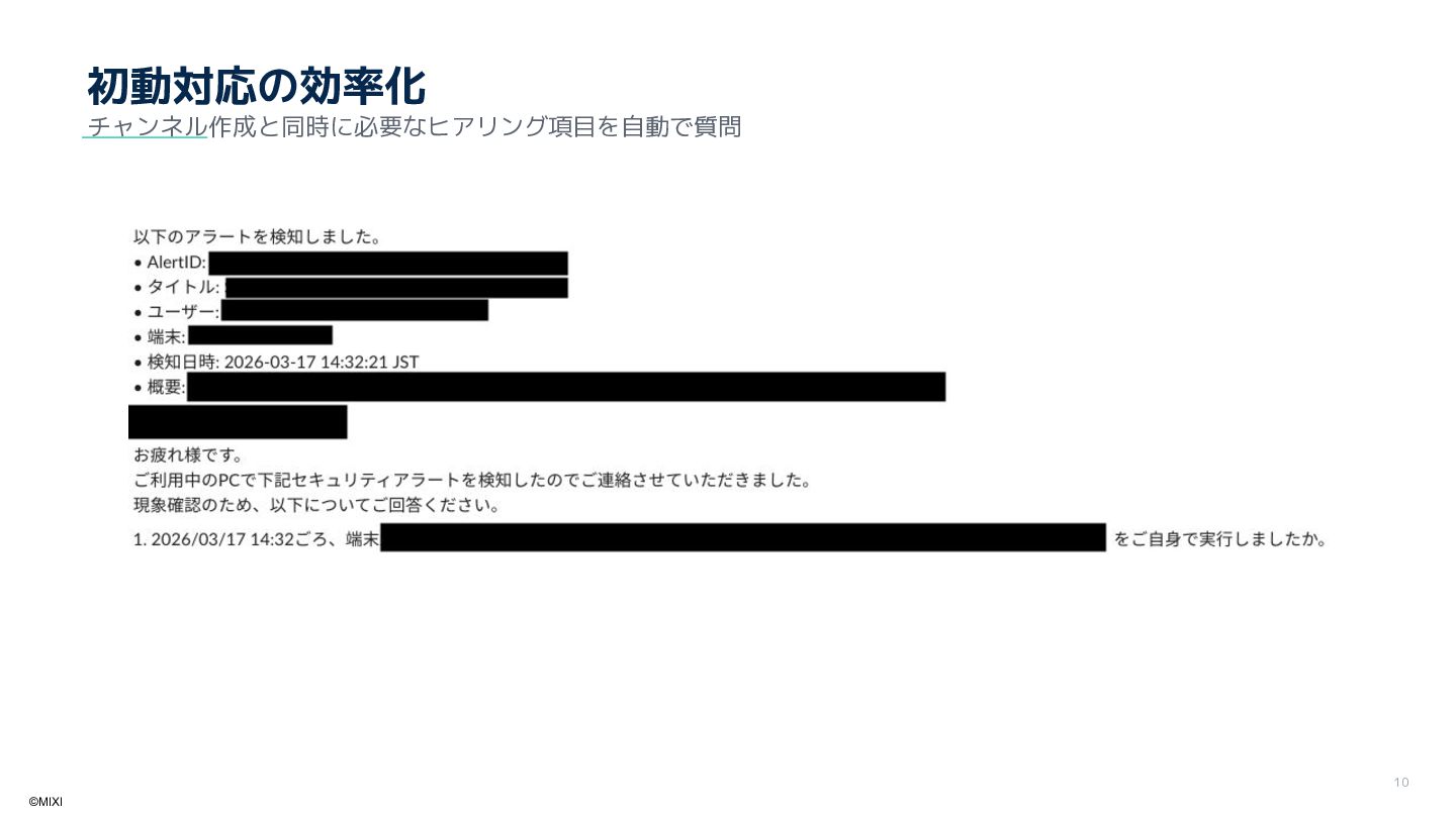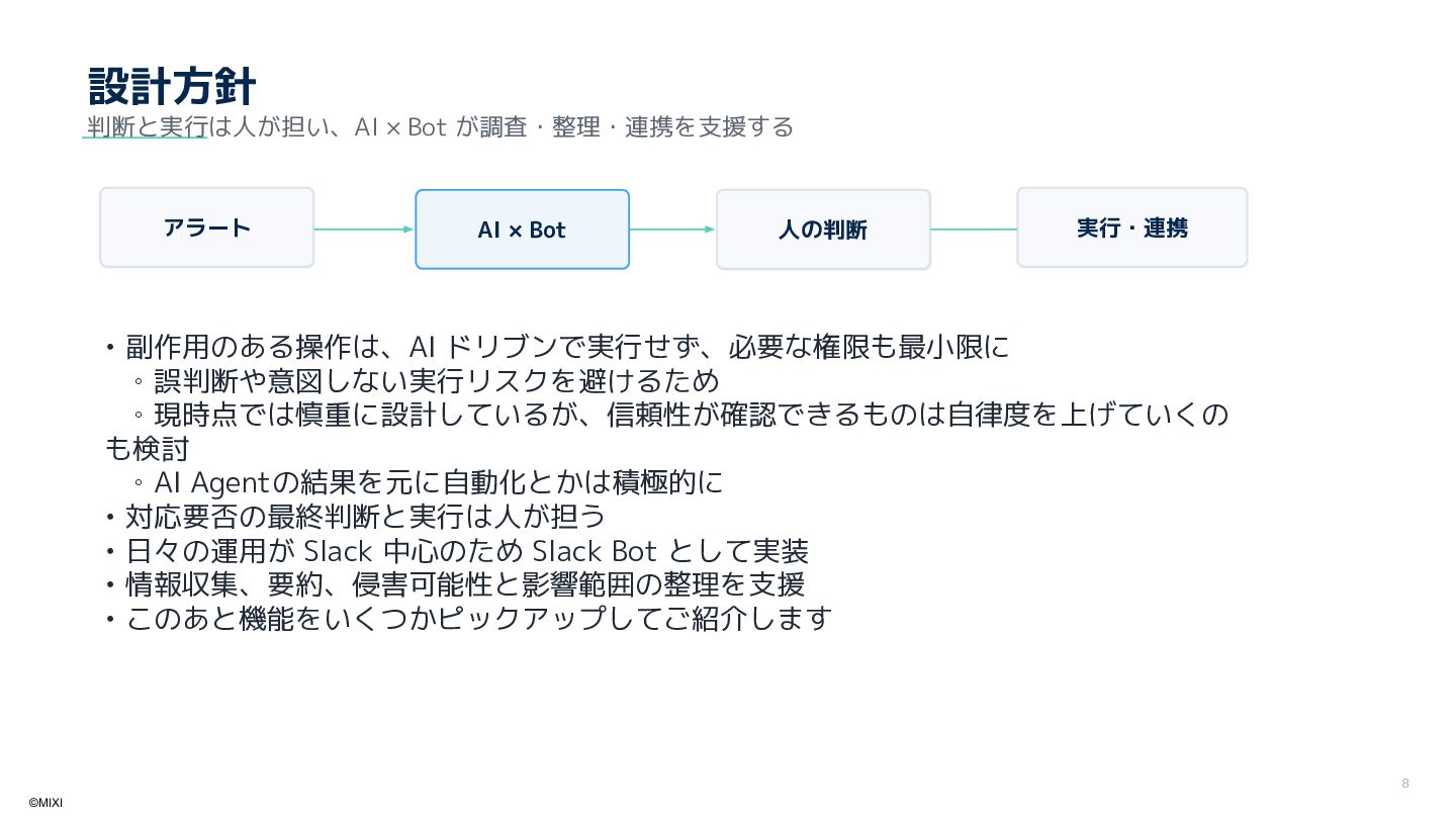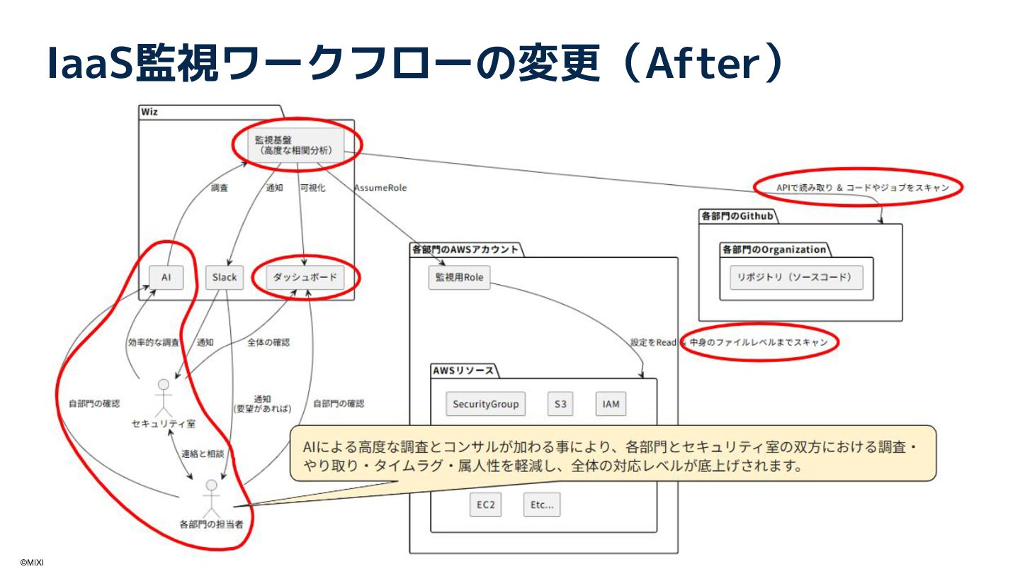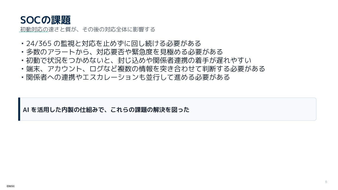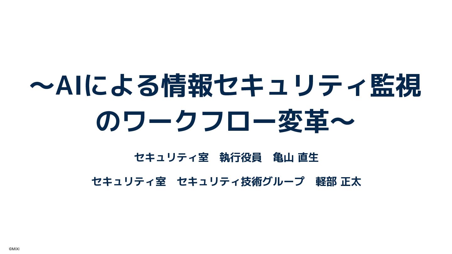 当社では開発環境やPCに対して情報セキュリティの監視を行っています。従来であれば自動で上がったアラートへの対応や調査には専門人材が必要となります。当社ではAIを活用することで専門人材の数を当期計画から4名削減しつつ、ソフトウェアサプライチェーン含めた最新リスクに対処可能なシステムと体制を構築しており、その運用の一部を紹介します。