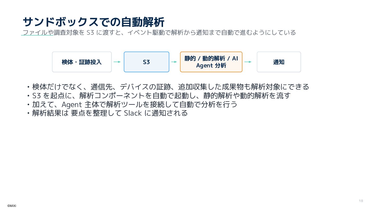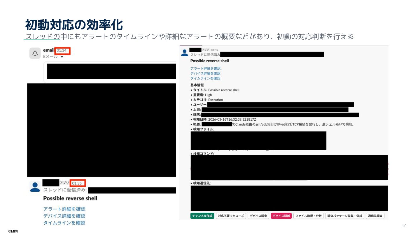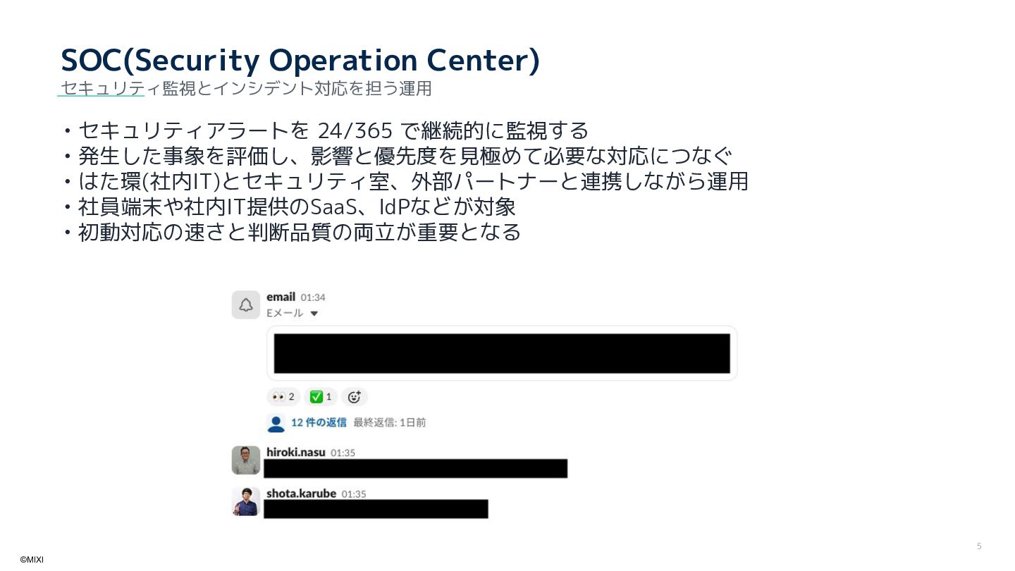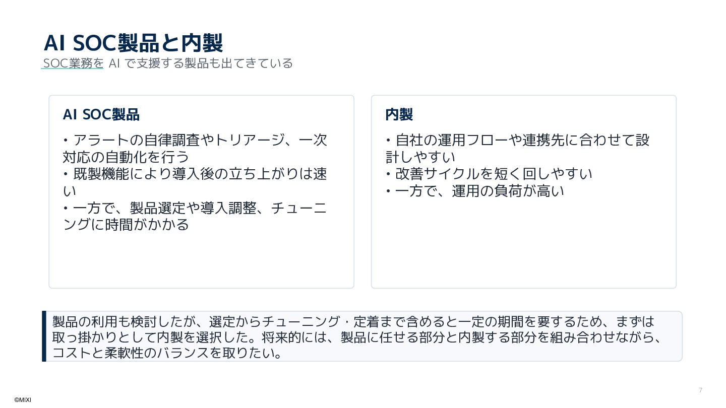 当社では開発環境やPCに対して情報セキュリティの監視を行っています。従来であれば自動で上がったアラートへの対応や調査には専門人材が必要となります。当社ではAIを活用することで専門人材の数を当期計画から4名削減しつつ、ソフトウェアサプライチェーン含めた最新リスクに対処可能なシステムと体制を構築しており、その運用の一部を紹介します。