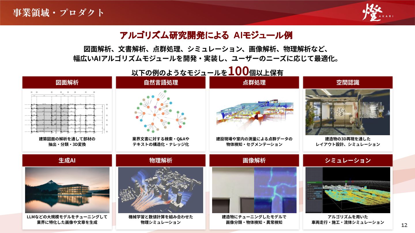 AI SaaS DXソリューション事業 AI SaaS事業 研究開発したアルゴリズムを独⾃のAI開発 基盤を⽤いて蓄積し、AIモジュールとして 保有。コンサルティングやオーダーメイド 開発を通じて、各企業様のビジネスモデル やワークフローに最適な形でカスタマイズ して提供。 燈固有のAIモジュールを搭載し、さらに業 界固有の⽂化やワークフローに最適な UI/UXに仕上げたプロダクトを提供。 11