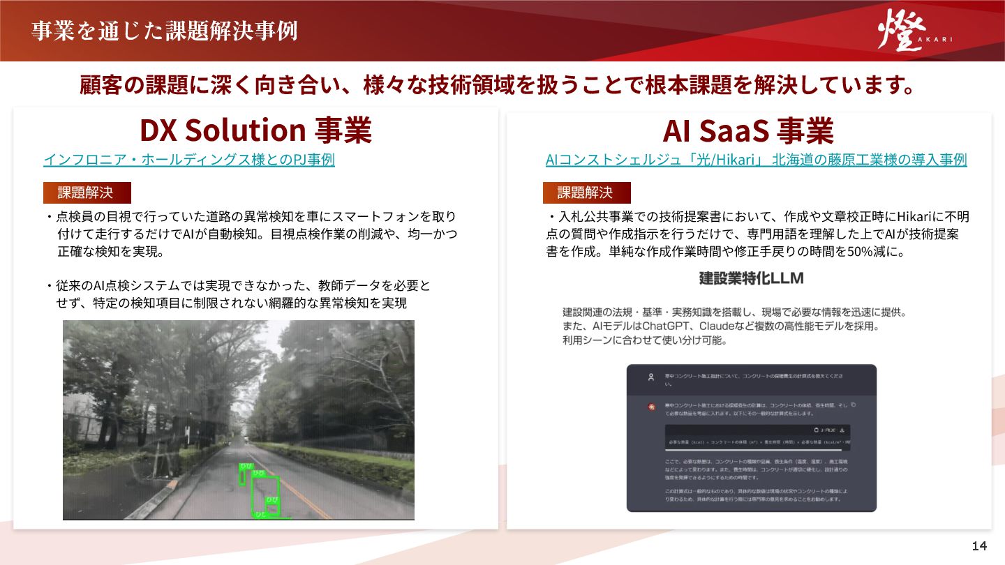 付けて⾛⾏するだけでAIが⾃動検知。⽬視点検作業の削減や、均⼀かつ 正確な検知を実現。 ‧従来のAI点検システムでは実現できなかった、教師データを必要と  せず、特定の検知項⽬に制限されない網羅的な異常検知を実現 AIコンストシェルジュ「光/Hikari」 北海道の藤原⼯業様の導⼊事例 ‧⼊札公共事業での技術提案書において、作成や⽂章校正時にHikariに不明 点の質問や作成指⽰を⾏うだけで、専⾨⽤語を理解した上でAIが技術提案 書を作成。単純な作成作業時間や修正⼿戻りの時間を50%減に。 課題解決 課題解決 14