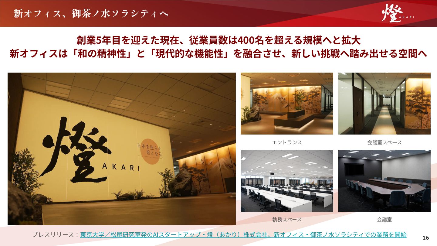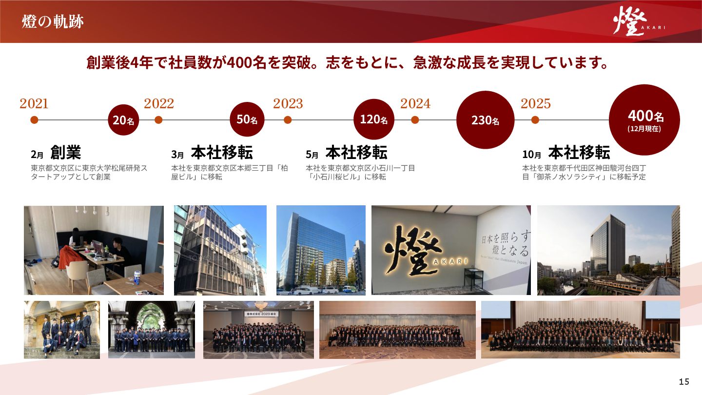 50名 2022 2023 2024 2025 3⽉  本社移転 本社を東京都⽂京区本郷三丁⽬「柏 屋ビル」に移転 5⽉  本社移転 本社を東京都⽂京区⼩⽯川⼀丁⽬ 「⼩⽯川桜ビル」に移転 10⽉  本社移転 本社を東京都千代⽥区神⽥駿河台四丁 ⽬「御茶ノ⽔ソラシティ」に移転予定 400名 (12⽉現在) 15