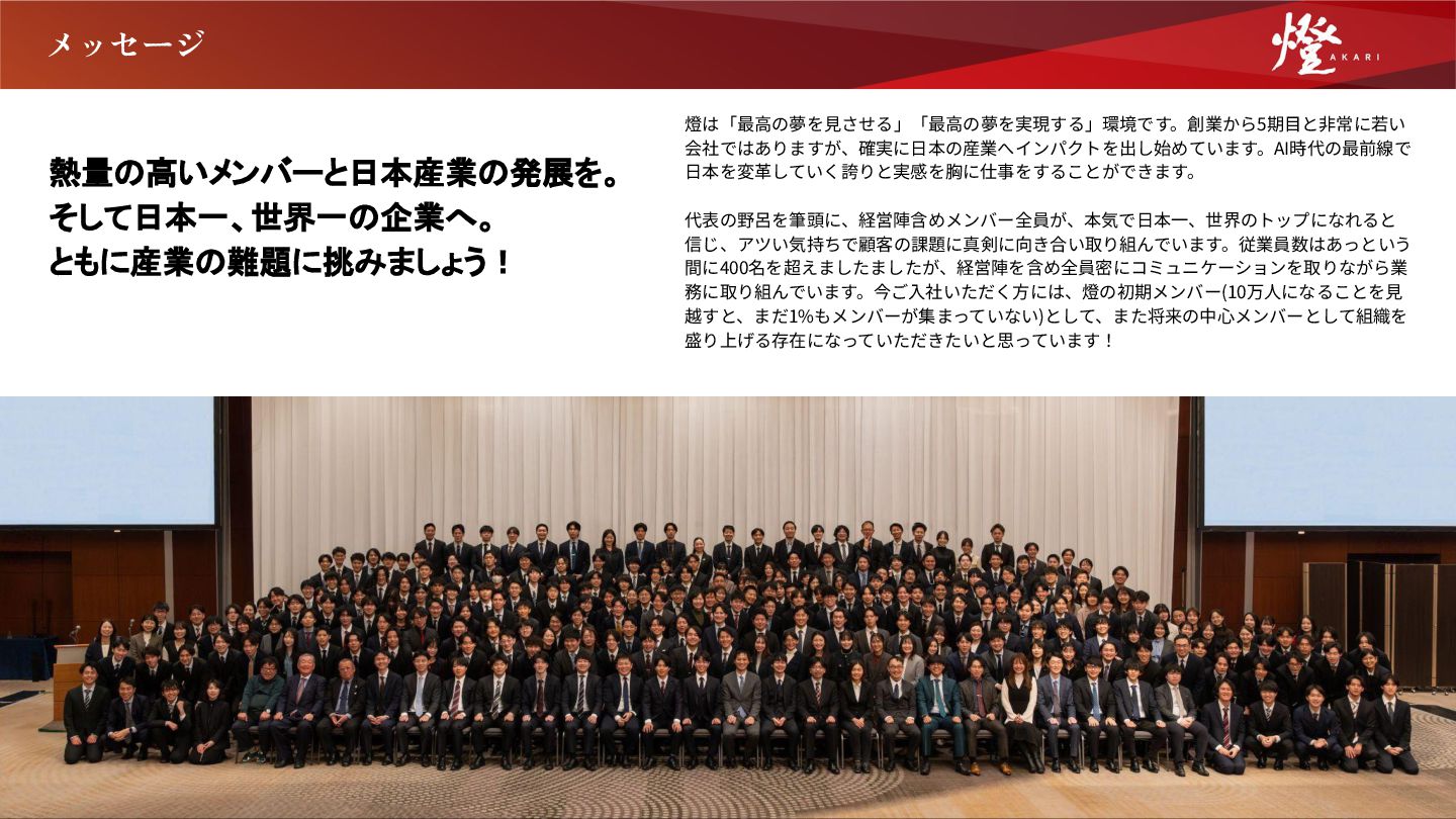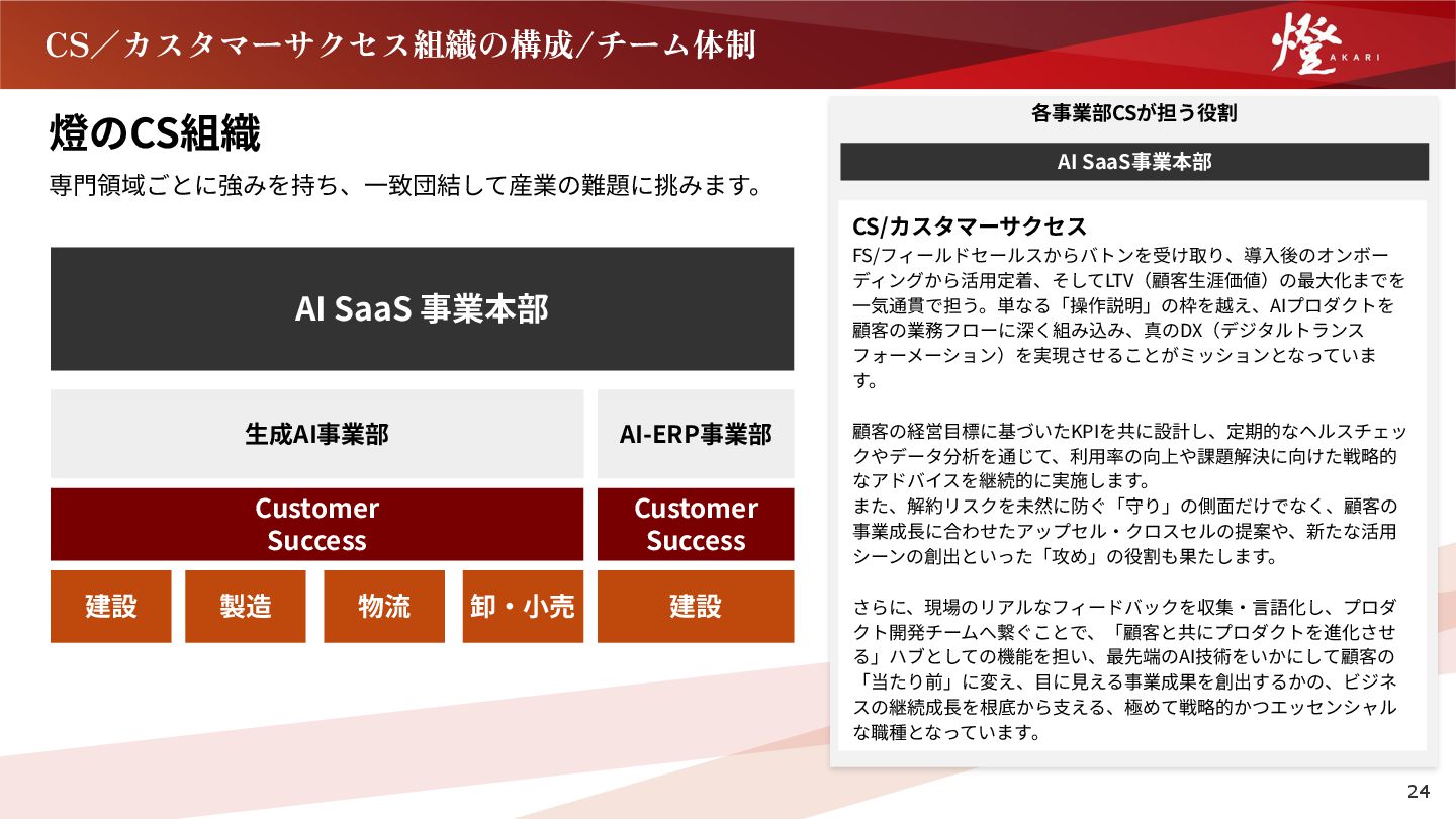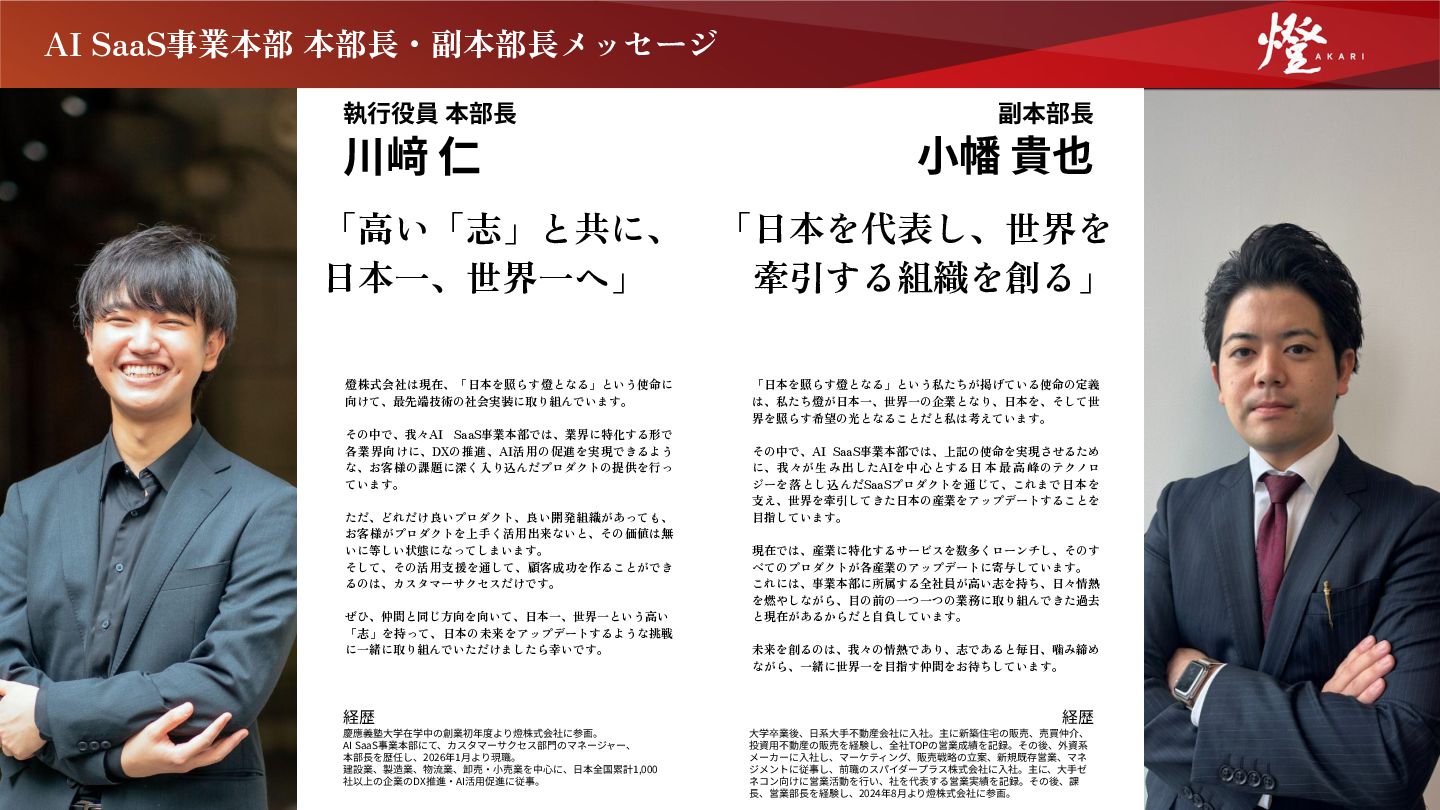 な、お客様の課題に深く入り込んだプロダクトの提供を行っ ています。 ただ、どれだけ良いプロダクト、良い開発組織があっても、 お客様がプロダクトを上手く活用出来ないと、その価値は無 いに等しい状態になってしまいます。 そして、その活用支援を通して、顧客成功を作ることができ るのは、カスタマーサクセスだけです。 ぜひ、仲間と同じ方向を向いて、日本一、世界一という高い 「志」を持って、日本の未来をアップデートするような挑戦 に一緒に取り組んでいただけましたら幸いです。 執⾏役員 本部⻑ 川﨑 仁 経歴 慶應義塾⼤学在学中の創業初年度より燈株式会社に参画。 AI SaaS事業本部にて、カスタマーサクセス部⾨のマネージャー、 本部⻑を歴任し、2026年1⽉より現職。 建設業、製造業、物流業、卸売‧⼩売業を中⼼に、⽇本全国累計1,000 社以上の企業のDX推進‧AI活⽤促進に従事。 「日本を代表し、世界を 牽引する組織を創る」 副本部⻑ ⼩幡 貴也 経歴 ⼤学卒業後、⽇系⼤⼿不動産会社に⼊社。主に新築住宅の販売、売買仲介、 投資⽤不動産の販売を経験し、全社TOPの営業成績を記録。その後、外資系 メーカーに⼊社し、マーケティング、販売戦略の⽴案、新規既存営業、マネ ジメントに従事し、前職のスパイダープラス株式会社に⼊社。主に、⼤⼿ゼ ネコン向けに営業活動を⾏い、社を代表する営業実績を記録。その後、課 ⻑、営業部⻑を経験し、2024年8⽉より燈株式会社に参画。 21 「日本を照らす燈となる」という私たちが掲げている使命の定義 は、私たち燈が日本一、世界一の企業となり、日本を、そして世 界を照らす希望の光となることだと私は考えています。 その中で、AI SaaS事業本部では、上記の使命を実現させるため に、我々が生み出したAIを中 心とする日 本 最 高 峰のテクノロ ジーを落とし込んだSaaSプロダクトを通じて、これまで日本を 支え、世界を牽引してきた日本の産業をアップデートすることを 目指しています。 現在では、産業に特化するサービスを数多くローンチし、そのす べてのプロダクトが各産業のアップデートに寄与しています。 これには、事業本部に所属する全社員が高い志を持ち、日々情熱 を燃やしながら、目の前の一つ一つの業務に取り組んできた過去 と現在があるからだと自負しています。 未来を創るのは、我々の情熱であり、志であると毎日、噛み締め ながら、一緒に世界一を目指す仲間をお待ちしています。