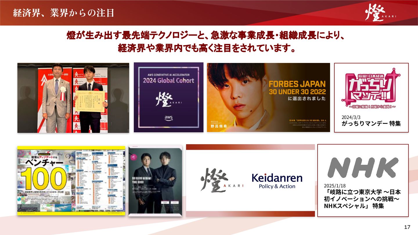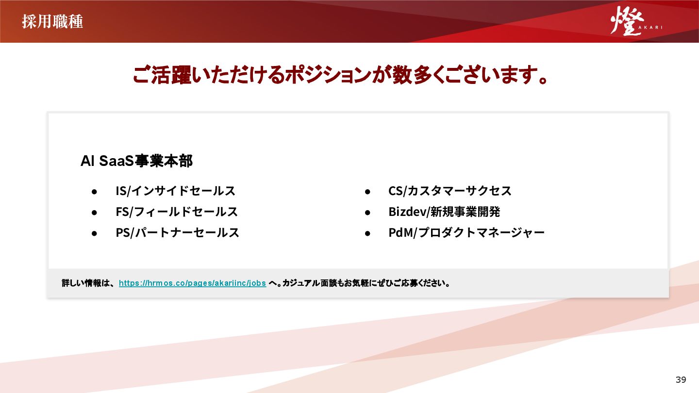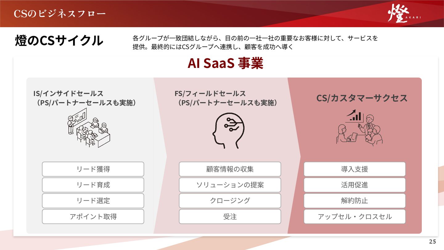 な、お客様の課題に深く入り込んだプロダクトの提供を行っ ています。 ただ、どれだけ良いプロダクト、良い開発組織があっても、 お客様がプロダクトを上手く活用出来ないと、その価値は無 いに等しい状態になってしまいます。 そして、その活用支援を通して、顧客成功を作ることができ るのは、カスタマーサクセスだけです。 ぜひ、仲間と同じ方向を向いて、日本一、世界一という高い 「志」を持って、日本の未来をアップデートするような挑戦 に一緒に取り組んでいただけましたら幸いです。 執⾏役員 本部⻑ 川﨑 仁 経歴 慶應義塾⼤学在学中の創業初年度より燈株式会社に参画。 AI SaaS事業本部にて、カスタマーサクセス部⾨のマネージャー、 本部⻑を歴任し、2026年1⽉より現職。 建設業、製造業、物流業、卸売‧⼩売業を中⼼に、⽇本全国累計1,000 社以上の企業のDX推進‧AI活⽤促進に従事。 「日本を代表し、世界を 牽引する組織を創る」 副本部⻑ ⼩幡 貴也 経歴 ⼤学卒業後、⽇系⼤⼿不動産会社に⼊社。主に新築住宅の販売、売買仲介、 投資⽤不動産の販売を経験し、全社TOPの営業成績を記録。その後、外資系 メーカーに⼊社し、マーケティング、販売戦略の⽴案、新規既存営業、マネ ジメントに従事し、前職のスパイダープラス株式会社に⼊社。主に、⼤⼿ゼ ネコン向けに営業活動を⾏い、社を代表する営業実績を記録。その後、課 ⻑、営業部⻑を経験し、2024年8⽉より燈株式会社に参画。 21 「日本を照らす燈となる」という私たちが掲げている使命の定義 は、私たち燈が日本一、世界一の企業となり、日本を、そして世 界を照らす希望の光となることだと私は考えています。 その中で、AI SaaS事業本部では、上記の使命を実現させるため に、我々が生み出したAIを中 心とする日 本 最 高 峰のテクノロ ジーを落とし込んだSaaSプロダクトを通じて、これまで日本を 支え、世界を牽引してきた日本の産業をアップデートすることを 目指しています。 現在では、産業に特化するサービスを数多くローンチし、そのす べてのプロダクトが各産業のアップデートに寄与しています。 これには、事業本部に所属する全社員が高い志を持ち、日々情熱 を燃やしながら、目の前の一つ一つの業務に取り組んできた過去 と現在があるからだと自負しています。 未来を創るのは、我々の情熱であり、志であると毎日、噛み締め ながら、一緒に世界一を目指す仲間をお待ちしています。