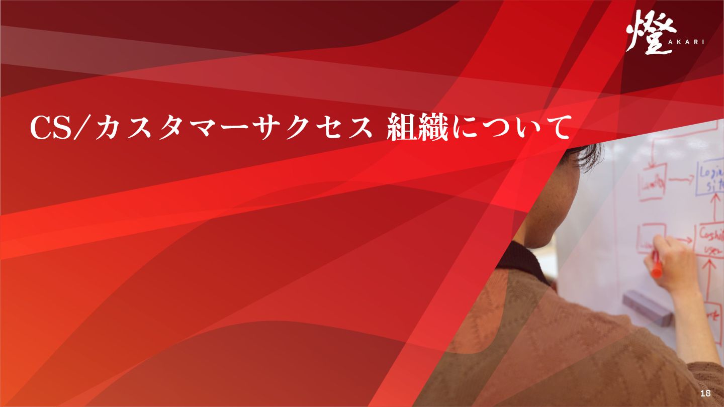 16. 事業に向き合うCS/カスタマーサクセス組織 顧客成功と事業推進に コミットするCS組織 顧客の成功に対する熱意を持ち、産業の難題を深い共感とデータで解く。そのために燈のCSはプロダク トの専⾨性を持ち、現場の深層まで⼊り込み、徹底的に顧客の不に向き合う。 現状に満⾜することなく、⾼い志を全員が持ち、⼀致団結して産業の変⾰を牽引する。 顧客理解 顧客の課題を圧倒的当事者意識で理解し、適 切なタイミングで適切な内容の提案をする 顧客情報の事前リサーチ