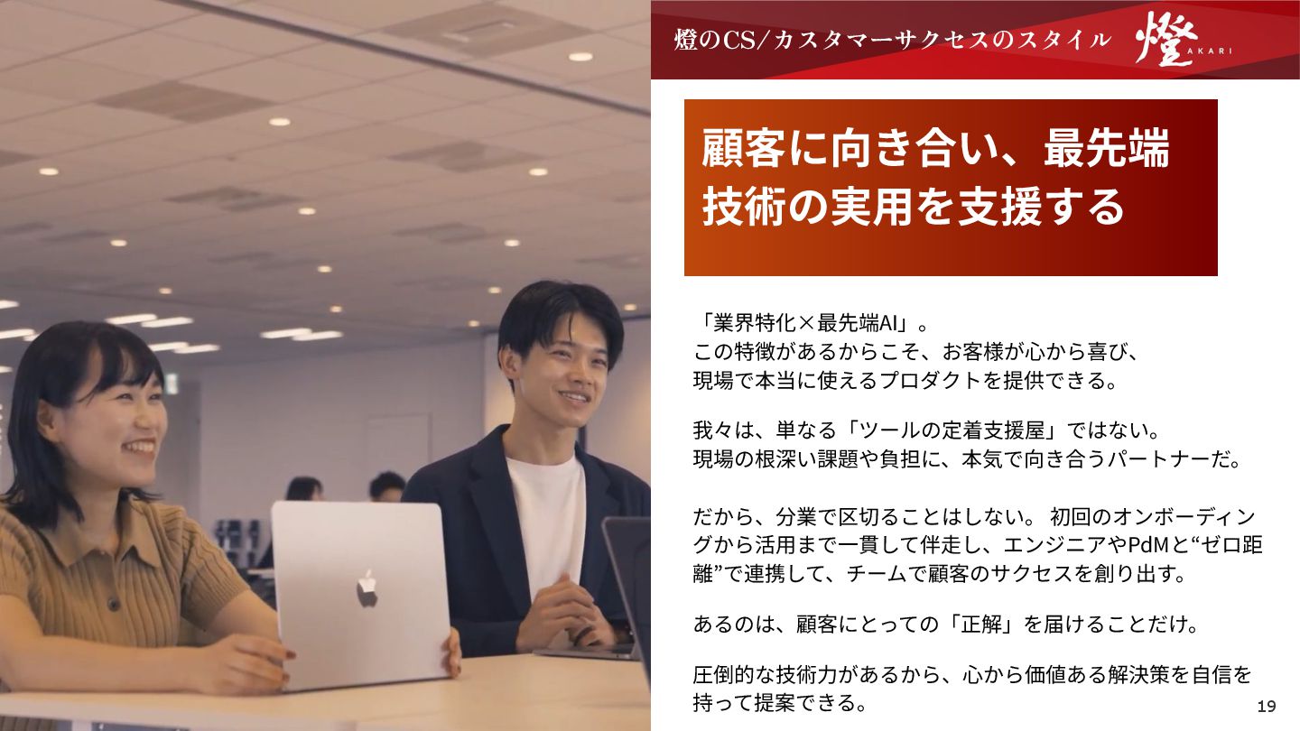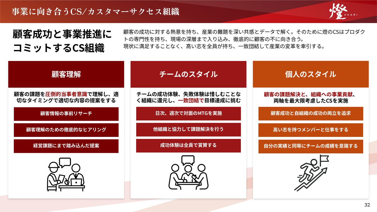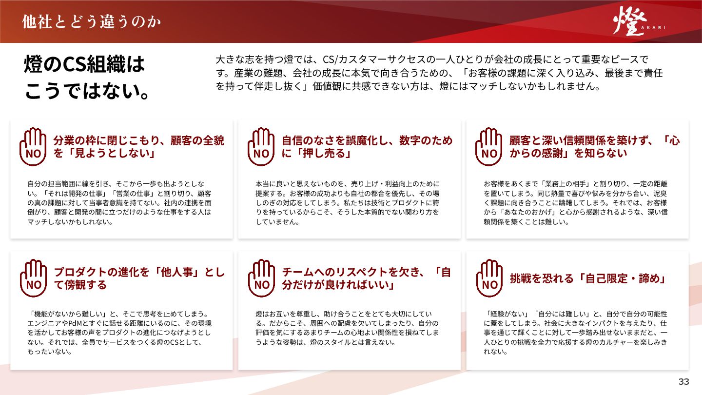 こうではない。 ⼤きな志を持つ燈では、CS/カスタマーサクセスの⼀⼈ひとりが会社の成⻑にとって重要なピースで す。産業の難題、会社の成⻑に本気で向き合うための、「お客様の課題に深く⼊り込み、最後まで責任 を持って伴⾛し抜く」価値観に共感できない⽅は、燈にはマッチしないかもしれません。 分業の枠に閉じこもり、顧客の全貌 を「⾒ようとしない」 ⾃分の担当範囲に線を引き、そこから⼀歩も出ようとしな い。「それは開発の仕事」「営業の仕事」と割り切り、顧客 の真の課題に対して当事者意識を持てない。社内の連携を⾯ 倒がり、顧客と開発の間に⽴つだけのような仕事をする⼈は マッチしないかもしれない。 NO チームへのリスペクトを⽋き、「⾃ 分だけが良ければいい」 燈はお互いを尊重し、助け合うことをとても⼤切にしてい る。だからこそ、周囲への配慮を⽋いてしまったり、⾃分の 評価を気にするあまりチームの⼼地よい関係性を損ねてしま うような姿勢は、燈のスタイルとは⾔えない。 NO ⾃信のなさを誤魔化し、数字のため に「押し売る」 本当に良いと思えないものを、売り上げ‧利益向上のために 提案する。お客様の成功よりも⾃社の都合を優先し、その場 しのぎの対応をしてしまう。私たちは技術とプロダクトに誇 りを持っているからこそ、そうした本質的でない関わり⽅を していません。 NO 挑戦を恐れる「⾃⼰限定‧諦め」 「経験がない」「⾃分には難しい」と、⾃分で⾃分の可能性 に蓋をしてしまう。社会に⼤きなインパクトを与えたり、仕 事を通じて輝くことに対して⼀歩踏み出せないままだと、⼀ ⼈ひとりの挑戦を全⼒で応援する燈のカルチャーを楽しみき れない。 NO 顧客と深い信頼関係を築けず、「⼼ からの感謝」を知らない お客様をあくまで「業務上の相⼿」と割り切り、⼀定の距離 を置いてしまう。同じ熱量で喜びや悩みを分かち合い、泥臭 く課題に向き合うことに躊躇してしまう。それでは、お客様 から「あなたのおかげ」と⼼から感謝されるような、深い信 頼関係を築くことは難しい。 NO 33