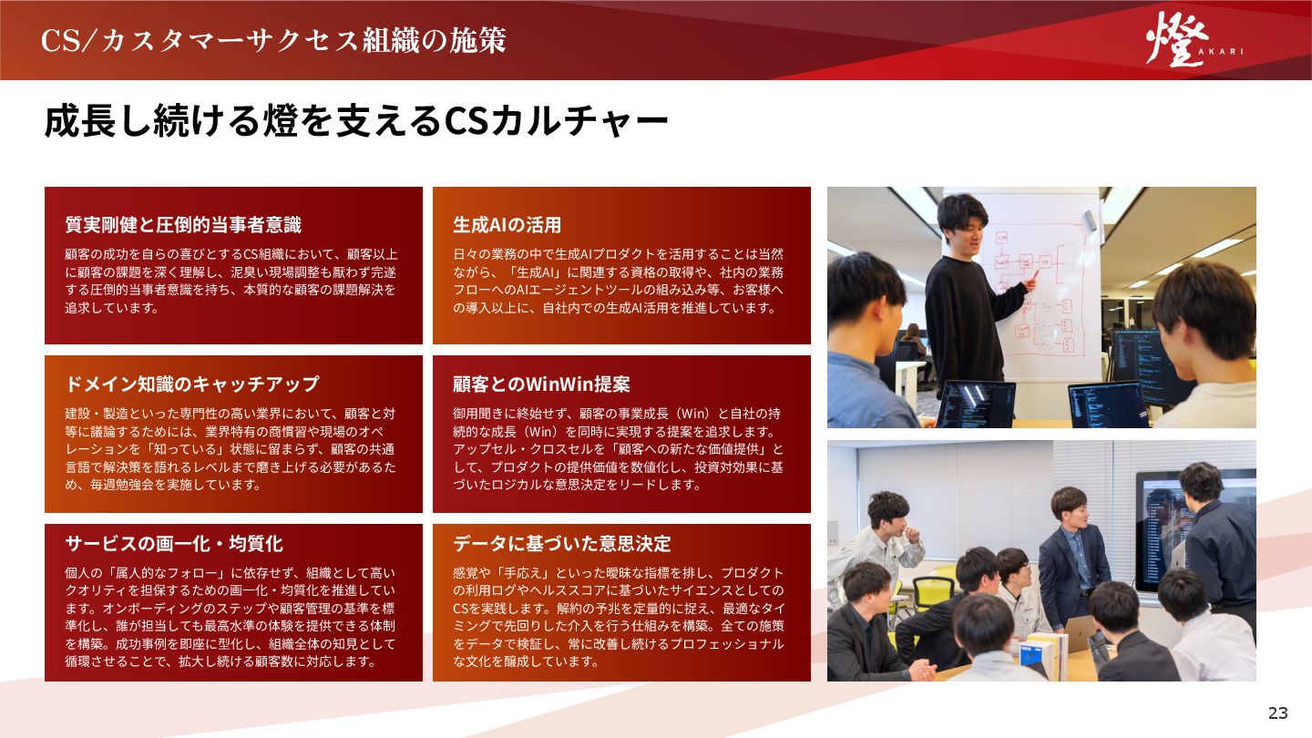 フローへのAIエージェントツールの組み込み等、お客様へ の導⼊以上に、⾃社内での⽣成AI活⽤を推進しています。 ドメイン知識のキャッチアップ 建設‧製造といった専⾨性の⾼い業界において、顧客と対 等に議論するためには、業界特有の商慣習や現場のオペ レーションを「知っている」状態に留まらず、顧客の共通 ⾔語で解決策を語れるレベルまで磨き上げる必要があるた め、毎週勉強会を実施しています。 顧客とのWinWin提案 御⽤聞きに終始せず、顧客の事業成⻑(Win)と⾃社の持 続的な成⻑(Win)を同時に実現する提案を追求します。 アップセル‧クロスセルを「顧客への新たな価値提供」と して、プロダクトの提供価値を数値化し、投資対効果に基 づいたロジカルな意思決定をリードします。 サービスの画⼀化‧均質化 個⼈の「属⼈的なフォロー」に依存せず、組織として⾼い クオリティを担保するための画⼀化‧均質化を推進してい ます。オンボーディングのステップや顧客管理の基準を標 準化し、誰が担当しても最⾼⽔準の体験を提供できる体制 を構築。成功事例を即座に型化し、組織全体の知⾒として 循環させることで、拡⼤し続ける顧客数に対応します。 データに基づいた意思決定 感覚や「⼿応え」といった曖昧な指標を排し、プロダクト の利⽤ログやヘルススコアに基づいたサイエンスとしての CSを実践します。解約の予兆を定量的に捉え、最適なタイ ミングで先回りした介⼊を⾏う仕組みを構築。全ての施策 をデータで検証し、常に改善し続けるプロフェッショナル な⽂化を醸成しています。 23