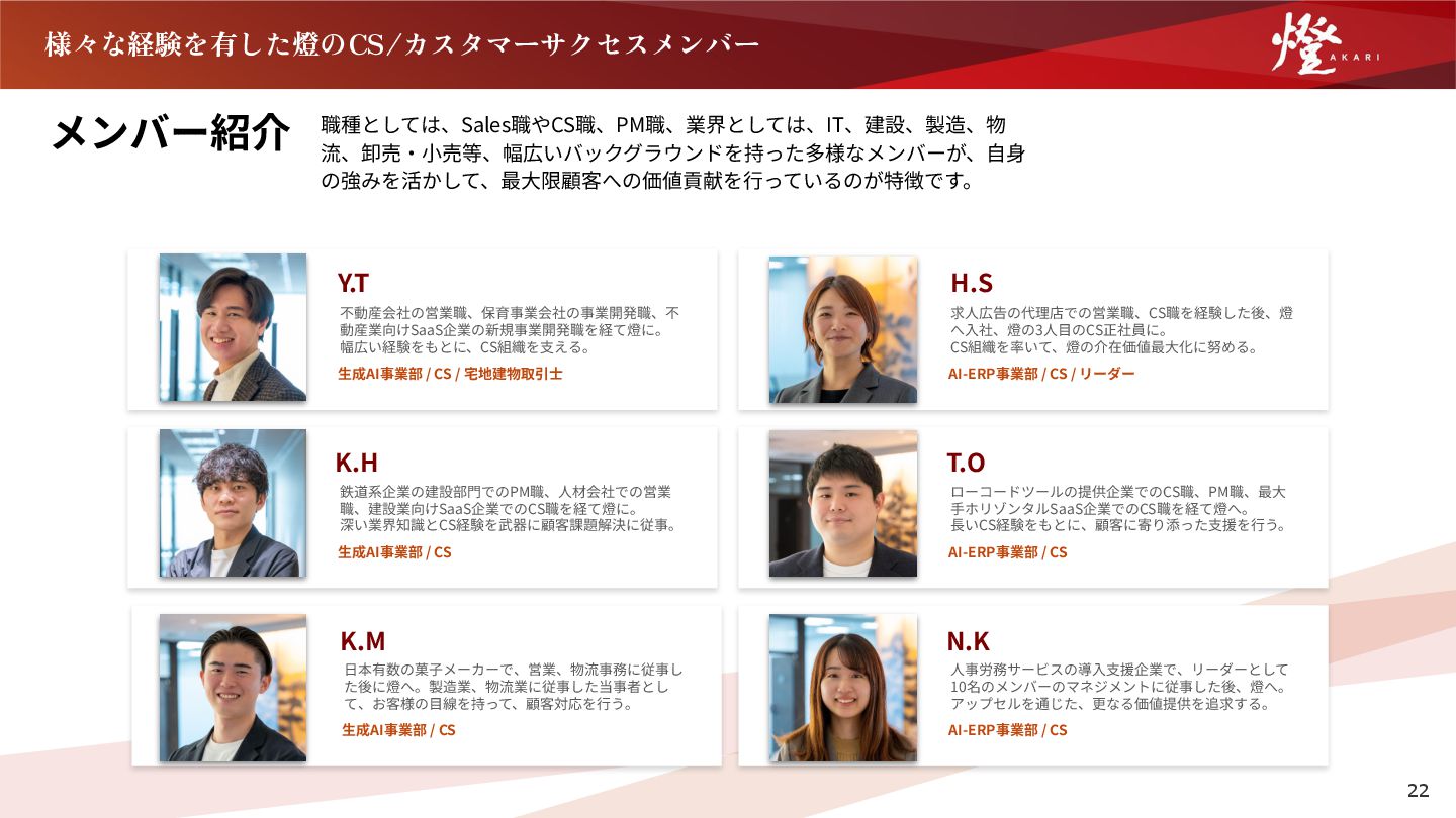 / CS 求⼈広告の代理店での営業職、CS職を経験した後、燈 へ⼊社、燈の3⼈⽬のCS正社員に。 CS組織を率いて、燈の介在価値最⼤化に努める。 H.S 不動産会社の営業職、保育事業会社の事業開発職、不 動産業向けSaaS企業の新規事業開発職を経て燈に。 幅広い経験をもとに、CS組織を⽀える。 Y.T K.M ⽣成AI事業部 / CS / 宅地建物取引⼠ T.O ローコードツールの提供企業でのCS職、PM職、最⼤ ⼿ホリゾンタルSaaS企業でのCS職を経て燈へ。 ⻑いCS経験をもとに、顧客に寄り添った⽀援を⾏う。 AI-ERP事業部 / CS K.H 鉄道系企業の建設部⾨でのPM職、⼈材会社での営業 職、建設業向けSaaS企業でのCS職を経て燈に。 深い業界知識とCS経験を武器に顧客課題解決に従事。 ⽣成AI事業部 / CS AI-ERP事業部 / CS / リーダー ⼈事労務サービスの導⼊⽀援企業で、リーダーとして 10名のメンバーのマネジメントに従事した後、燈へ。 アップセルを通じた、更なる価値提供を追求する。 AI-ERP事業部 / CS N.K