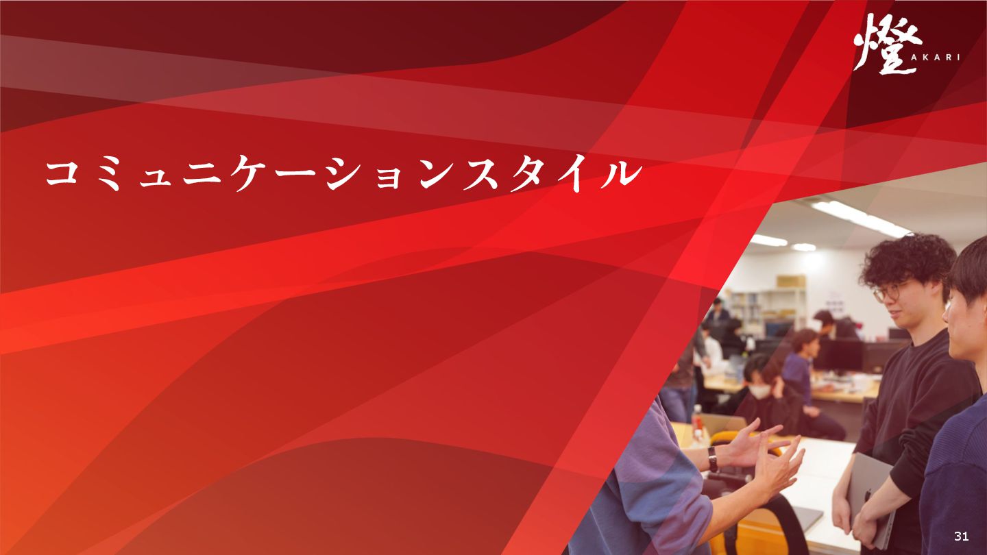 現状の仕様でできないことも、開発を通して「本当にお客様が 求めていること」に近づける努⼒を⽇々続けている。その全⼒ の姿勢が顧客にも伝わり、協⼒してサービスを作り上げている 実感がある。 働きやすい環境を⾃分たちで作る意識が⾼い。組織全体で当た り前のことを当たり前に維持することは意外と難しいが、それ ができている点に素直に感動した。 特定の個⼈に依存する業務をなくし、誰かが休んでも会社とし て対応できる体制がある。稼働時間を正確に申告できるなど、 変な気遣いなく「お互い様」で働ける雰囲気が良い。 「やったことがないからやめておこう」ではなく「やってみよ う!」という空気感がある。何がなんでも前に進もうとする姿 勢があり、頑張りたい⼈が健全に頑張れる環境だと感じる。 「⾃分だけ良くなろう」というメンバーが⼀⼈もいない。どん なに忙しくても親⾝に相談に乗る先輩ばかりで、困っている⼈ がいれば積極的に助け合う良い循環が⽣まれている。 前職ではただのロボットのように感じていたが、燈では「志が すべて」。能⼒やスキルだけでなく努⼒ややる気を認める⽂化 があり、気合があれば誰でも挑戦の場を掴み取ることができ る。 34