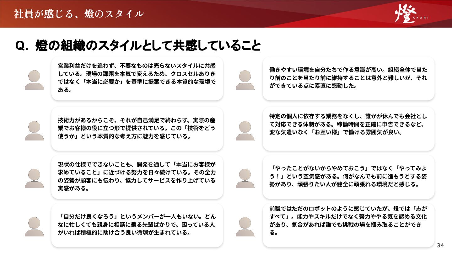 18. 社員が感じる、燈のスタイル Q. 燈の組織のスタイルとして共感していること 営業利益だけを追わず、不要なものは売らないスタイルに共感 している。現場の課題を本気で変えるため、クロスセルありき ではなく「本当に必要か」を基準に提案できる本質的な環境で ある。 技術⼒があるからこそ、それが⾃⼰満⾜で終わらず、実際の産 業でお客様の役に⽴つ形で提供されている。この「技術をどう 使うか」という本質的な考え⽅に魅⼒を感じている。