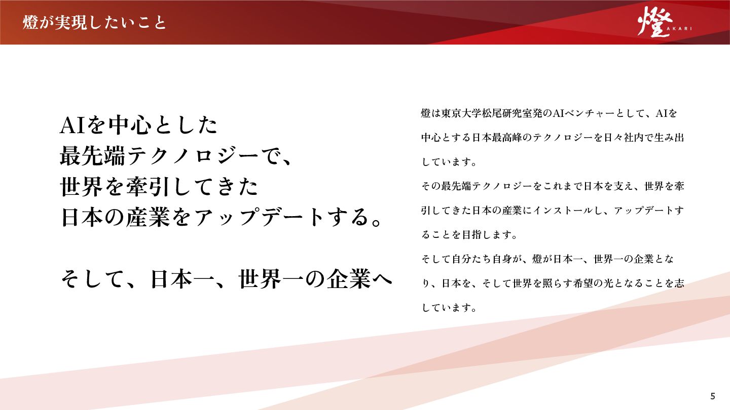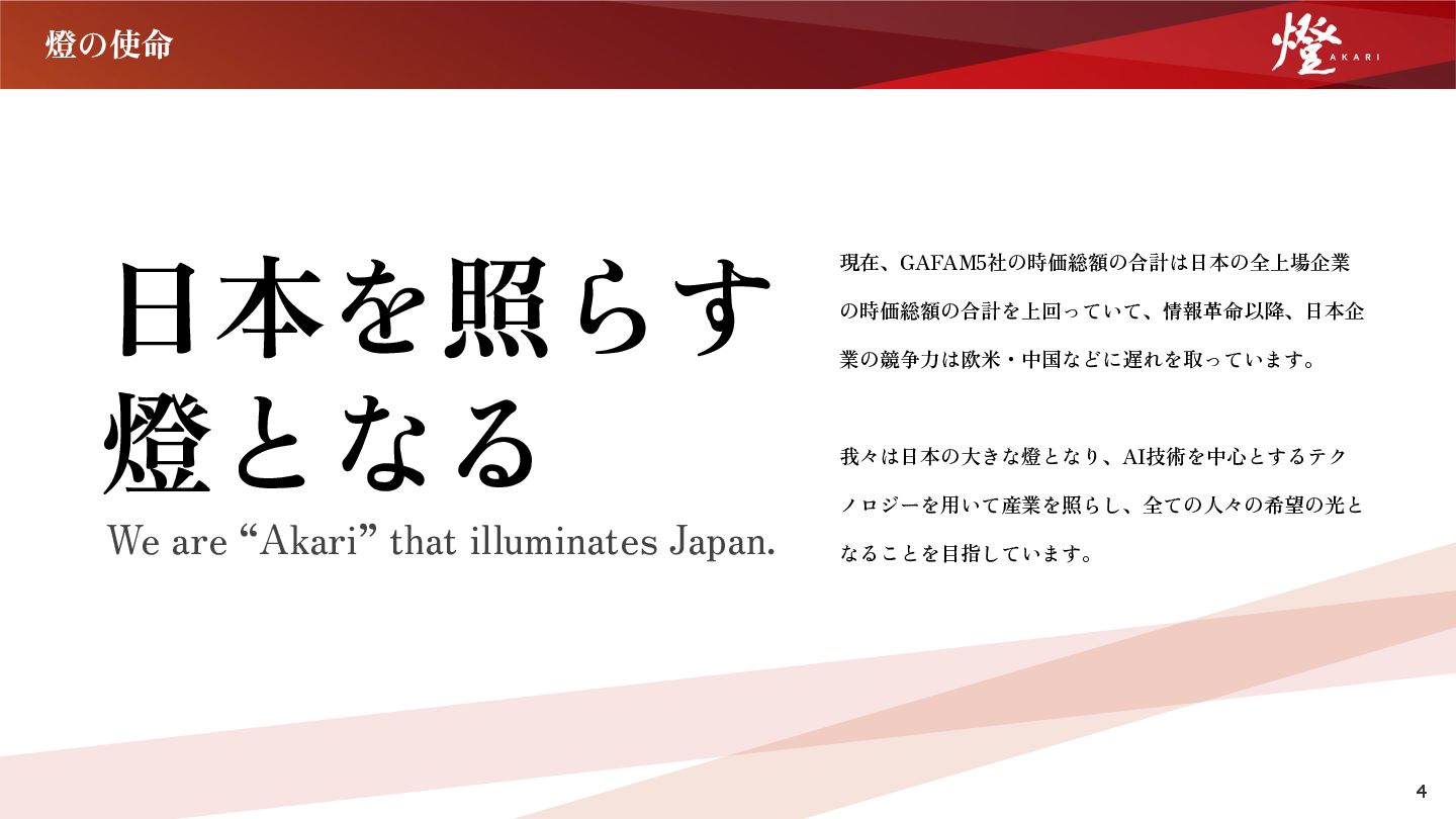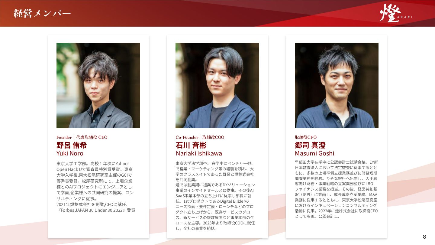 Hack Uで審査員特別賞受賞。東京 ⼤学⼊学後,東⼤松尾研究室主催のGCIで 優秀賞受賞。松尾研究所にて、上場企業 様とのAIプロジェクトにエンジニアとし て参画,企業様への共同研究の提案、コン サルティングに従事。 2021年燈株式会社を創業,CEOに就任. 『Forbes JAPAN 30 Under 30 2022』受賞 Co-Founder|取締役COO ⽯川 ⻫彬 Nariaki Ishikawa 東京⼤学法学部卒。 在学中にベンチャー4社 で営業‧マーケティング等の経験を積み、⼤ 学のクラスメイトであった野呂と燈株式会社 を共同創業。 燈では創業期に祖業であるDXソリューション 事業のインサイドセールスに従事。その後AI SaaS事業本部の⽴ち上げに従事し部⻑に就 任。1stプロダクトであるDigital Billderの ニーズ探索‧要件定義‧ローンチなどのプロ ダクト⽴ち上げから、既存サービスのグロー ス、新サービスの複数展開など事業本部のグ ロースを主導。2025年より取締役COOに就任 し、全社の事業を統括。 取締役CFO 郷司 真澄 Masumi Goshi 早稲⽥⼤学在学中に公認会計⼠試験合格。EY新 ⽇本監査法⼈において法定監査に従事するとと もに、多数の上場準備⽀援業務並びに財務短期 調査業務を経験。りそな銀⾏へ出向し、⼤⼿顧 客向け財務‧事業戦略の⽴案業務並びにLBO ファイナンス業務を担当。その後、経営共創基 盤(IGPI)に参画し、成⻑戦略⽴案業務、M&A 業務に従事するとともに、東京⼤学松尾研究室 におけるインキュベーションコンサルティング 活動に従事。2022年に燈株式会社に取締役CFO として参画。公認会計⼠.