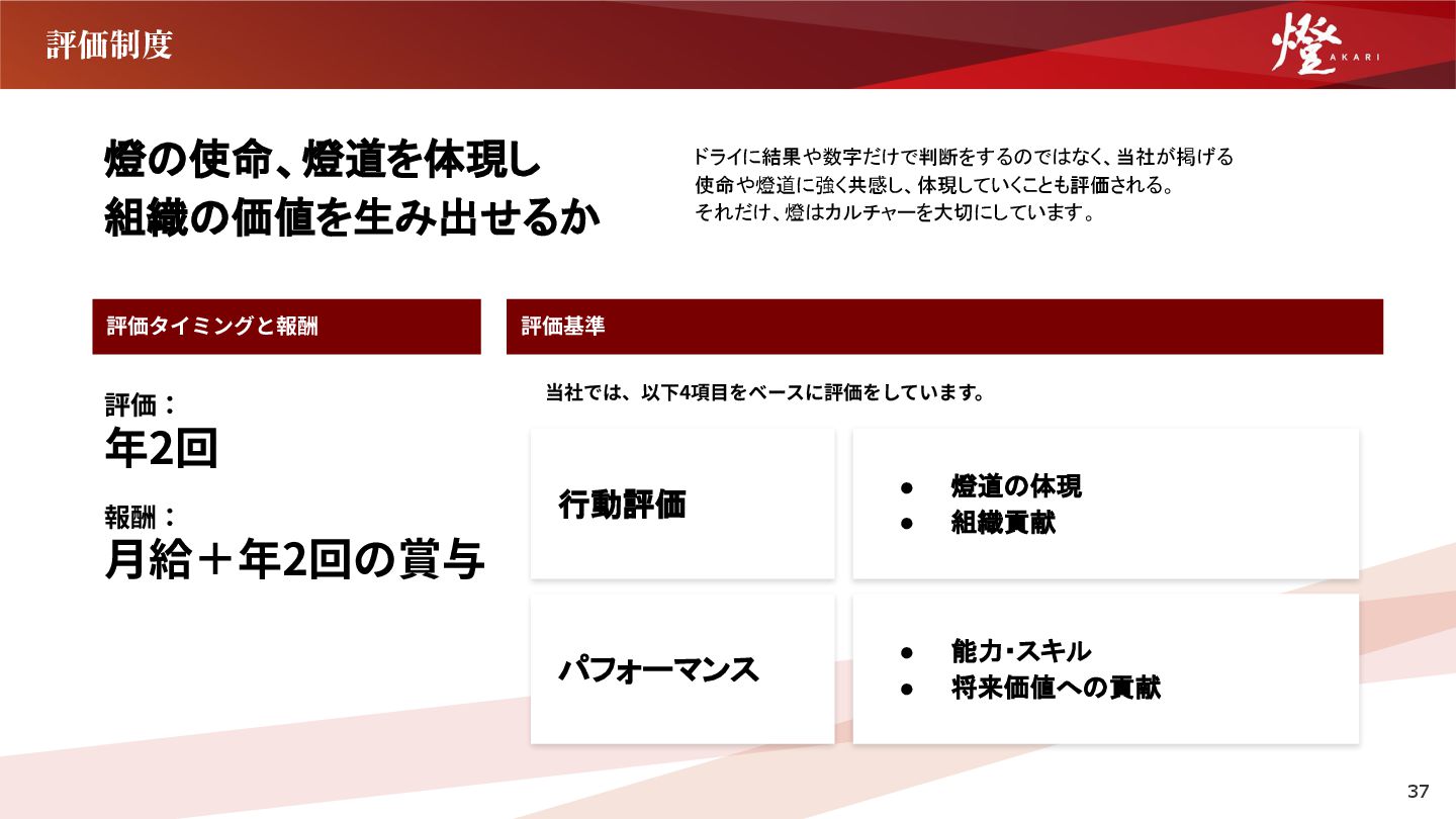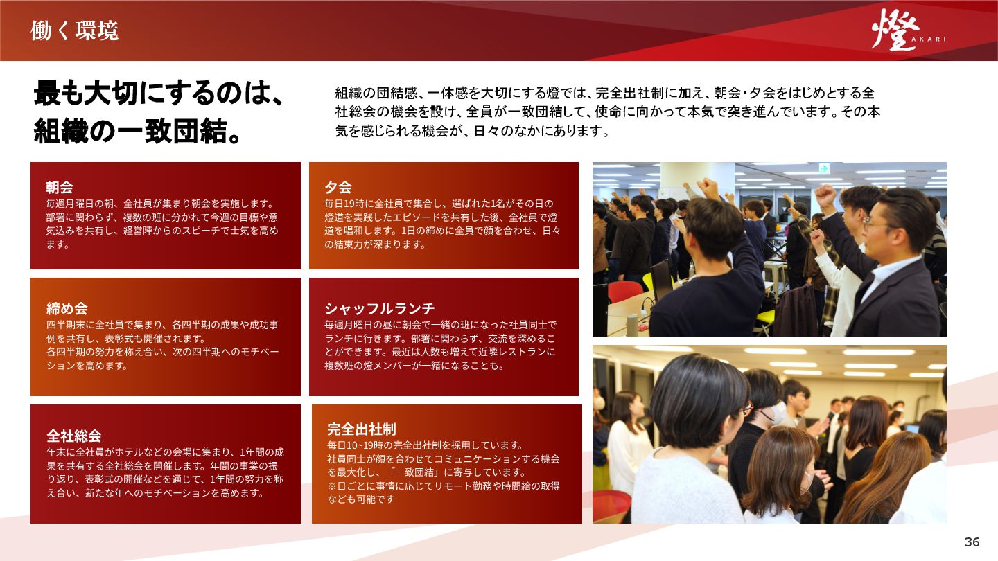 ます。 締め会  四半期末に全社員で集まり、各四半期の成果や成功事 例を共有し、表彰式も開催されます。 各四半期の努⼒を称え合い、次の四半期へのモチベー ションを⾼めます。 全社総会 年末に全社員がホテルなどの会場に集まり、1年間の成 果を共有する全社総会を開催します。年間の事業の振 り返り、表彰式の開催などを通じて、1年間の努⼒を称 え合い、新たな年へのモチベーションを⾼めます。 ⼣会 毎⽇19時に全社員で集合し、選ばれた1名がその⽇の 燈道を実践したエピソードを共有した後、全社員で燈 道を唱和します。1⽇の締めに全員で顔を合わせ、⽇々 の結束⼒が深まります。 シャッフルランチ 毎週⽉曜⽇の昼に朝会で⼀緒の班になった社員同⼠で ランチに⾏きます。部署に関わらず、交流を深めるこ とができます。最近は⼈数も増えて近隣レストランに 複数班の燈メンバーが⼀緒になることも。 完全出社制 毎⽇10~19時の完全出社制を採⽤しています。 社員同⼠が顔を合わせてコミュニケーションする機会 を最⼤化し、「⼀致団結」に寄与しています。 ※⽇ごとに事情に応じてリモート勤務や時間給の取得 なども可能です 36