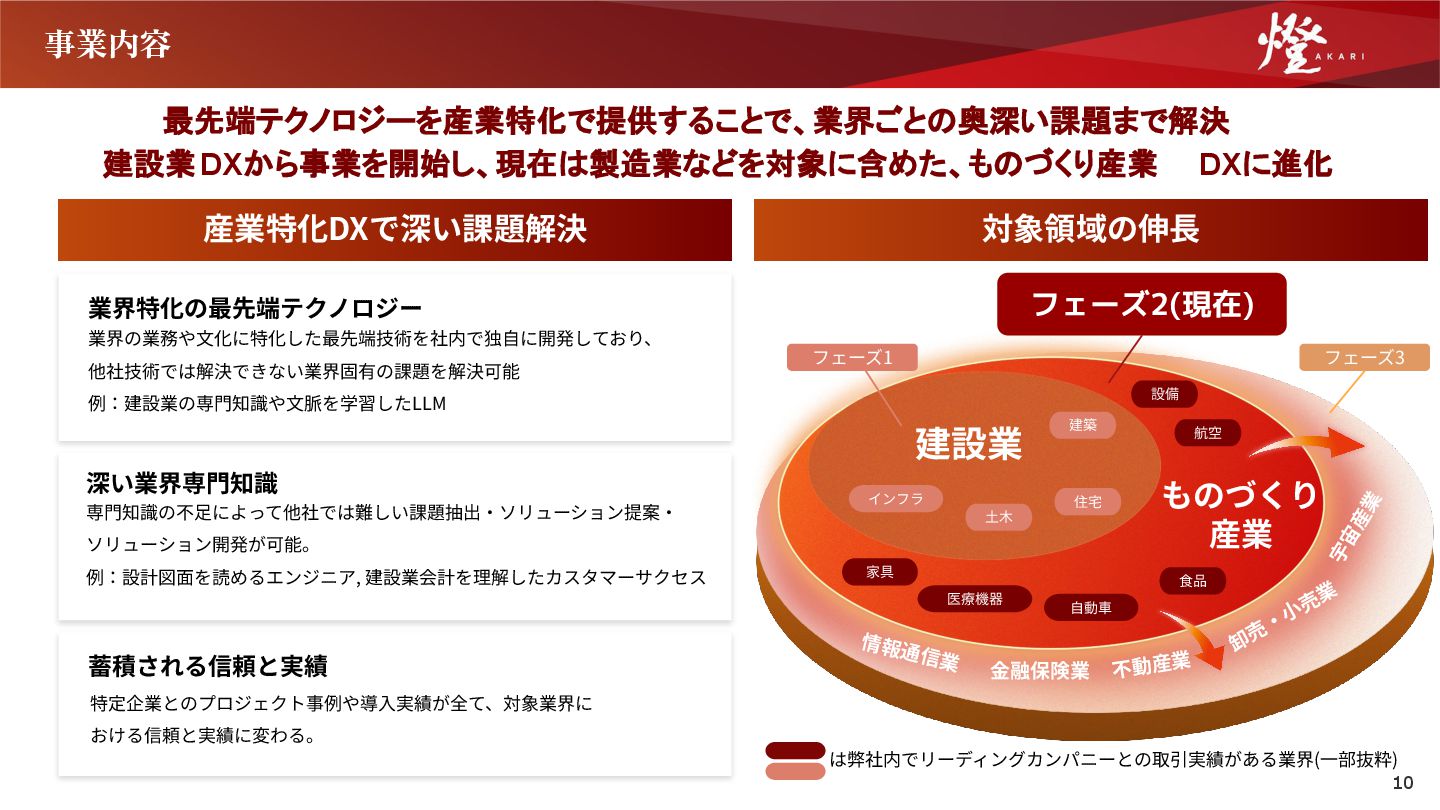 深い業界専⾨知識 専⾨知識の不⾜によって他社では難しい課題抽出‧ソリューション提案‧ ソリューション開発が可能。 例:設計図⾯を読めるエンジニア, 建設業会計を理解したカスタマーサクセス 蓄積される信頼と実績 特定企業とのプロジェクト事例や導⼊実績が全て、対象業界に おける信頼と実績に変わる。 は弊社内でリーディングカンパニーとの取引実績がある業界(⼀部抜粋) 対象領域の伸⻑ ものづくり 産業 フェーズ1 インフラ 住宅 建築 ⼟⽊ フェーズ2(現在) フェーズ3 宇 宙 産 業 建設業 家具 医療機器 ⾷品 ⾃動⾞ 航空 設備 情報通信業 ⾦融保険業 不動産業 10