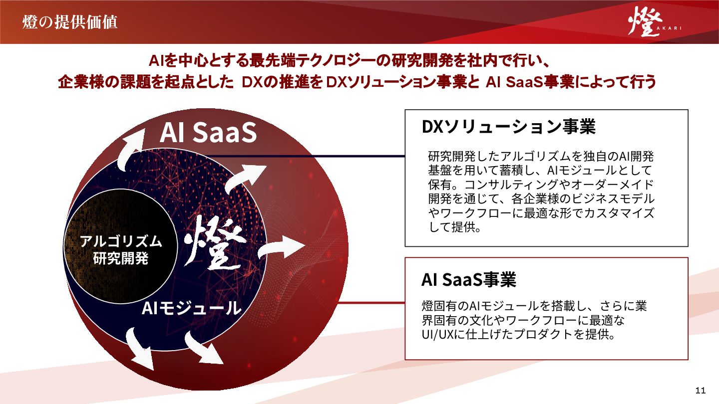AI SaaS DXソリューション事業 AI SaaS事業 研究開発したアルゴリズムを独⾃のAI開発 基盤を⽤いて蓄積し、AIモジュールとして 保有。コンサルティングやオーダーメイド 開発を通じて、各企業様のビジネスモデル やワークフローに最適な形でカスタマイズ して提供。 燈固有のAIモジュールを搭載し、さらに業 界固有の⽂化やワークフローに最適な UI/UXに仕上げたプロダクトを提供。 11