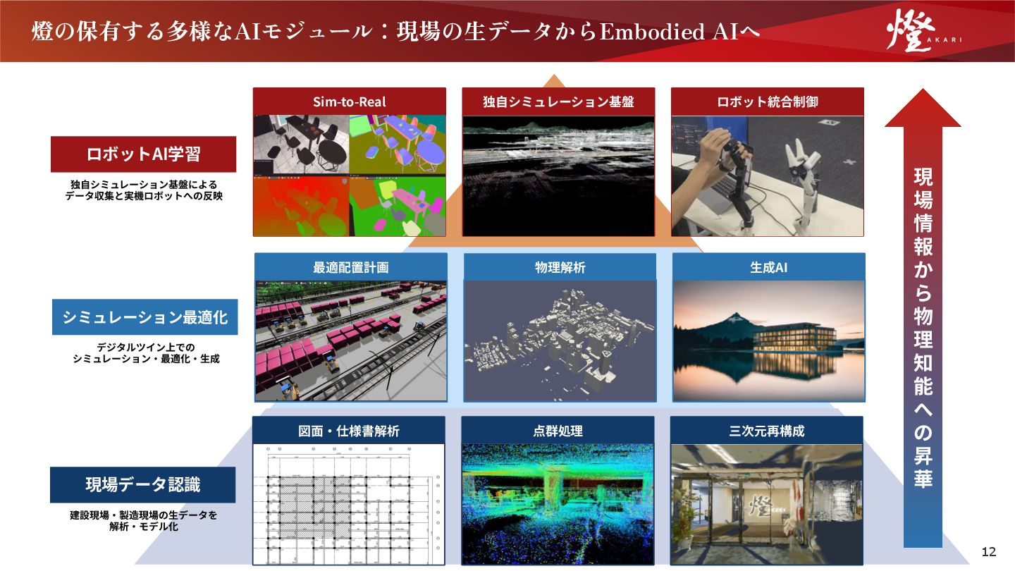 6. 燈の保有する多様なAIモジュール:現場の生データからEmbodied AIへ 12 図⾯‧仕様書解析 三次元再構成 点群処理 ⽣成AI 物理解析 最適配置計画 Sim-to-Real