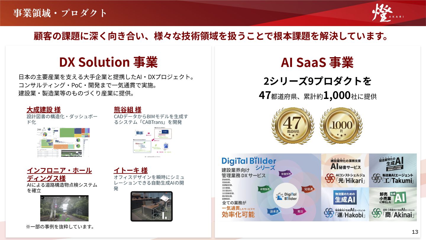 AIによる道路構造物点検システム を確⽴ イトーキ 様 オフィスデザインを瞬時にシミュ レーションできる⾃動⽣成AIの開 発 ⼤成建設 様 設計図書の構造化‧ダッシュボー ド化 熊⾕組 様 CADデータからBIMモデルを⽣成す るシステム「CABTrans」を開発 ※⼀部の事例を抜粋しています。 13 AI SaaS 事業 2シリーズ9プロダクトを 47都道府県、累計約1,000社に提供