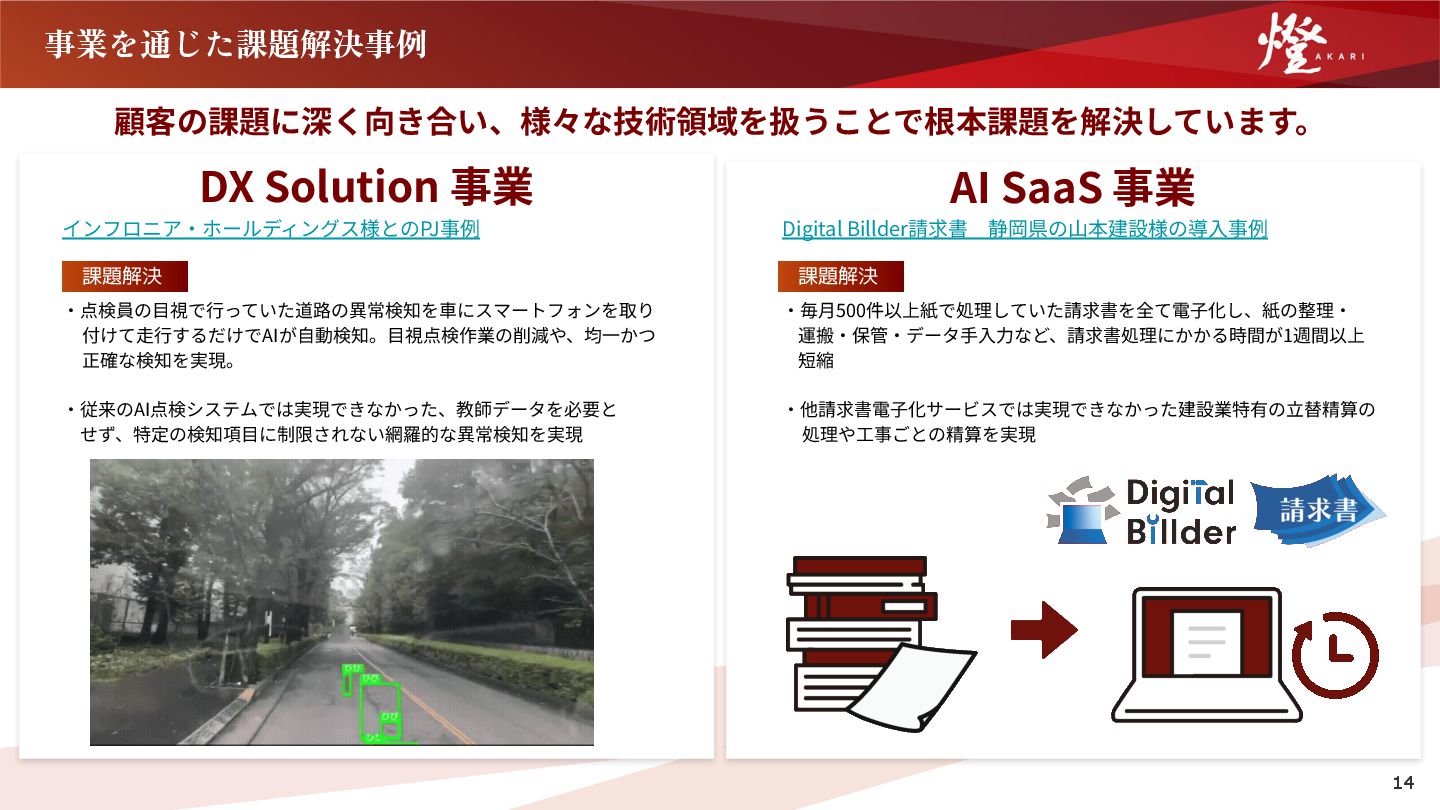 付けて⾛⾏するだけでAIが⾃動検知。⽬視点検作業の削減や、均⼀かつ 正確な検知を実現。 ‧従来のAI点検システムでは実現できなかった、教師データを必要と  せず、特定の検知項⽬に制限されない網羅的な異常検知を実現 Digital Billder請求書 静岡県の⼭本建設様の導⼊事例 ‧毎⽉500件以上紙で処理していた請求書を全て電⼦化し、紙の整理‧ 運搬‧保管‧データ⼿⼊⼒など、請求書処理にかかる時間が1週間以上 短縮 ‧他請求書電⼦化サービスでは実現できなかった建設業特有の⽴替精算の 処理や⼯事ごとの精算を実現 課題解決 課題解決 14