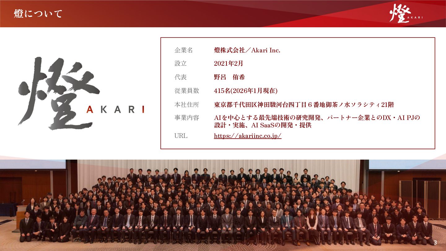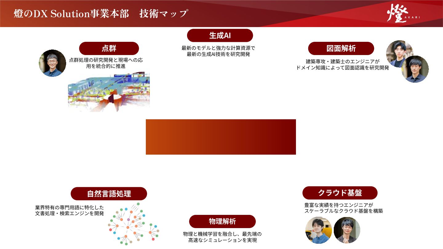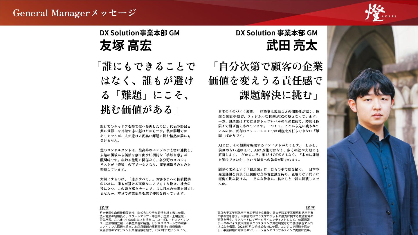 はなく、誰もが避け る「難題」にこそ、 挑む価値がある」 銀行でのキャリアを捨て燈へ参画したのは、代表の野呂と 共に世界一を目指す志に懸けたからです。私は器用では ありませんが、人が避ける泥臭い難題に挑む情熱は誰にも 負けません。 燈のコンサルタントは、最高峰のエンジニアと密に連携し、 未踏の領域から価値を創り出す圧倒的な「手触り感」が 醍醐味です。年齢や性別に関係なく、各分野のスペシャ リストが「燈道」の下で一丸となり、産業構造そのものを 変革しています。 大切にするのは、「志がすべて」。お客さまへの価値提供 のために、誰もが避ける面倒なことでもやり抜き、社会の 役に立つ。この誇り高きチームで、共に日本の未来を照らし ませんか。本気で産業変革を志す仲間を待っています。 DX Solution事業本部 GM 友塚 ⾼宏 経歴 明治安田生命保険相互会社、株式会社りそな銀行を経て当社参画。 法人営業の経験長く、スタートアップ・中堅中小企業・上場企業・ 官公庁等、これまで1,000社以上を担当し、コーポレートファイナン ス・企業戦略立案・不動産業務に精通。ビジネススクールでの財務・ ファイナンス講義も担当。本店営業部の事務局運営や役員秘書・ 支店長等のマネジメント業務経験を経て、2023年に燈にジョイン。 「自分次第で顧客の企業 価値を変えうる責任感で 課題解決に挑む」 日本のものづくり産業。 建設業は現場ごとの個別性が高く、複 雑な図面や慣習、フィジカルな制約がDXの壁となっています。 一方、製造業はすでに世界トップレベルの生産技術で、時間は極 限まで削ぎ落とされています。 つまり、ここから先に残されて いるのは、既存のソリューションでは到底太刀打ちできない「難 問」ばかりです。 AIには、その難問を突破するインパクトがあります。 しかし、 前例のない道ゆえに、AIは万能ではなく、多くの壁や失敗にも 直面します。 だからこそ、形だけのDXではなく、「本当に課題 を解決できたか」という結果への執着が問われます。 顧客の未来という「白地図」に、自らの手で絵を描く。 日本の 産業課題を背負う圧倒的な当事者意識を持ち、正解のない問いに 泥臭く挑み続ける。 そんな仕事に、私たちと一緒に挑戦しませ んか。 DX Solution 事業本部 GM 武⽥ 亮太 21