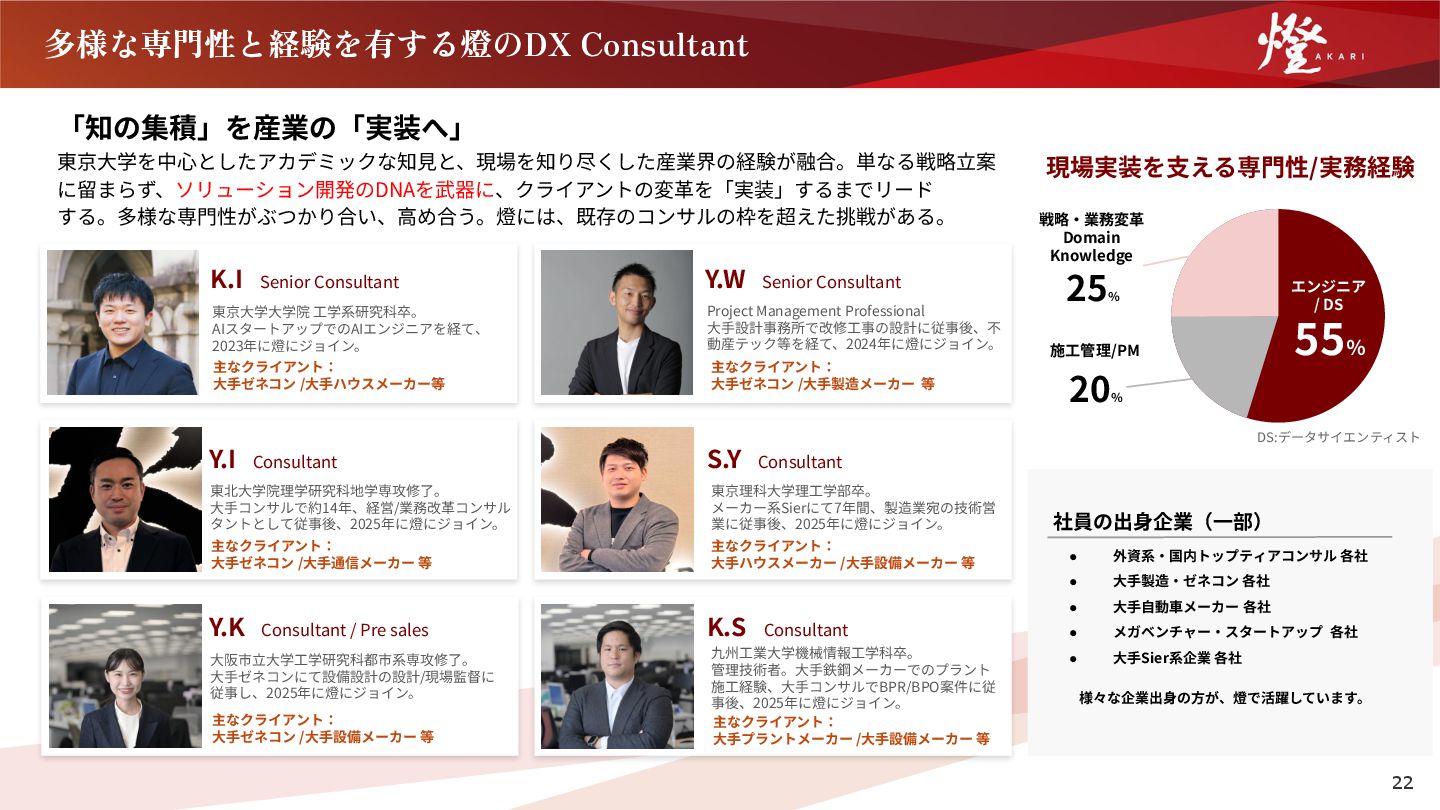 ⼤⼿⾃動⾞メーカー 各社 • メガベンチャー‧スタートアップ 各社 • ⼤⼿Sier系企業 各社 様々な企業出⾝の⽅が、燈で活躍しています。 現場実装を⽀える専⾨性/実務経験 「知の集積」を産業の「実装へ」 東京⼤学を中⼼としたアカデミックな知⾒と、現場を知り尽くした産業界の経験が融合。単なる戦略⽴案 に留まらず、ソリューション開発のDNAを武器に、クライアントの変⾰を「実装」するまでリード する。多様な専⾨性がぶつかり合い、⾼め合う。燈には、既存のコンサルの枠を超えた挑戦がある。 22 Project Management Professional ⼤⼿設計事務所で改修⼯事の設計に従事後、不 動産テック等を経て、2024年に燈にジョイン。 Y.W Senior Consultant 東京⼤学⼤学院 ⼯学系研究科卒。 AIスタートアップでのAIエンジニアを経て、 2023年に燈にジョイン。 K.I Senior Consultant Y.K Consultant / Pre sales 主なクライアント: ⼤⼿ゼネコン /⼤⼿ハウスメーカー等 S.Y Consultant Y.I Consultant 主なクライアント: ⼤⼿ゼネコン /⼤⼿製造メーカー 等 東北⼤学院理学研究科地学専攻修了。 ⼤⼿コンサルで約14年、経営/業務改⾰コンサル タントとして従事後、2025年に燈にジョイン。 主なクライアント: ⼤⼿ゼネコン /⼤⼿通信メーカー 等 東京理科⼤学理⼯学部卒。 メーカー系Sierにて7年間、製造業宛の技術営 業に従事後、2025年に燈にジョイン。 主なクライアント: ⼤⼿ハウスメーカー /⼤⼿設備メーカー 等 ⼤阪市⽴⼤学⼯学研究科都市系専攻修了。 ⼤⼿ゼネコンにて設備設計の設計/現場監督に 従事し、2025年に燈にジョイン。 主なクライアント: ⼤⼿ゼネコン /⼤⼿設備メーカー 等 K.S Consultant 九州⼯業⼤学機械情報⼯学科卒。 管理技術者。⼤⼿鉄鋼メーカーでのプラント 施⼯経験、⼤⼿コンサルでBPR/BPO案件に従 事後、2025年に燈にジョイン。 主なクライアント: ⼤⼿プラントメーカー /⼤⼿設備メーカー 等 エンジニア / DS 55 % 施⼯管理/PM 20 % 戦略‧業務変⾰ Domain Knowledge 25 % DS:データサイエンティスト