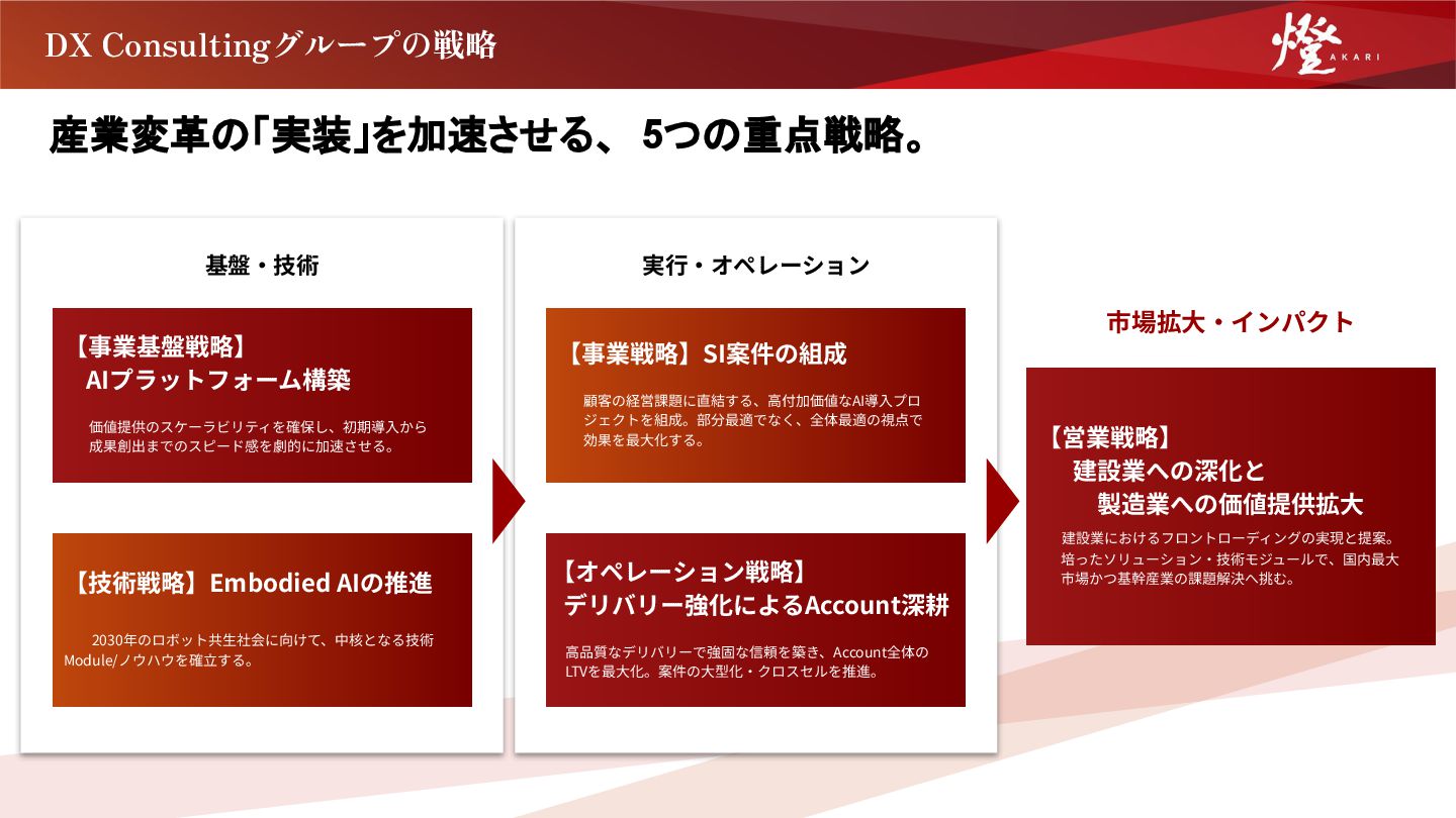2030年のロボット共⽣社会に向けて、中核となる技術   Module/ノウハウを確⽴する。 【営業戦略】   建設業への深化と   製造業への価値提供拡⼤   建設業におけるフロントローディングの実現と提案。   培ったソリューション‧技術モジュールで、国内最⼤   市場かつ基幹産業の課題解決へ挑む。 基盤‧技術 実⾏‧オペレーション 【事業戦略】SI案件の組成  顧客の経営課題に直結する、⾼付加価値なAI導⼊プロ  ジェクトを組成。部分最適でなく、全体最適の視点で  効果を最⼤化する。 【オペレーション戦略】 デリバリー強化によるAccount深耕  ⾼品質なデリバリーで強固な信頼を築き、Account全体の  LTVを最⼤化。案件の⼤型化‧クロスセルを推進。 市場拡⼤‧インパクト
