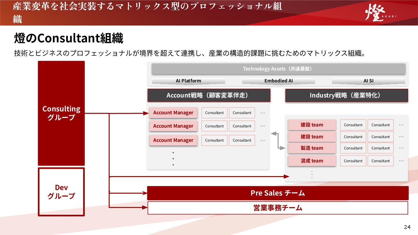 営業事務チーム Account戦略(顧客変⾰伴⾛) Industry戦略(産業特化) AI Platform Dev グループ Account Manager … Consultant Consultant Account Manager … Consultant Consultant Account Manager … Consultant Consultant • • • 建設 team … Consultant Consultant 建設 team … Consultant Consultant 製造 team … Consultant Consultant 混成 team … Consultant Consultant • • • Technology Assets(共通基盤) Embodied AI AI SI