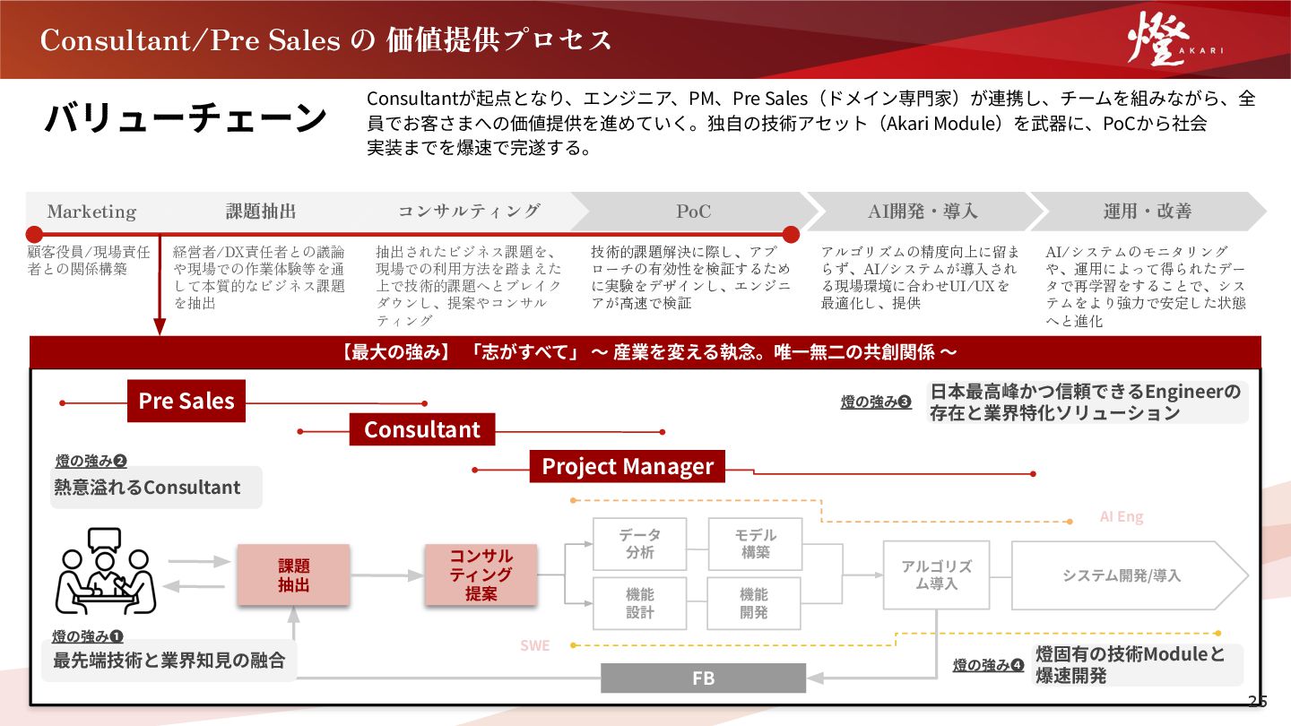 15. Consultant/Pre Sales の 価値提供プロセス バリューチェーン Consultantが起点となり、エンジニア、PM、Pre Sales(ドメイン専⾨家)が連携し、チームを組みながら、全 員でお客さまへの価値提供を進めていく。独⾃の技術アセット(Akari Module)を武器に、PoCから社会 実装までを爆速で完遂する。