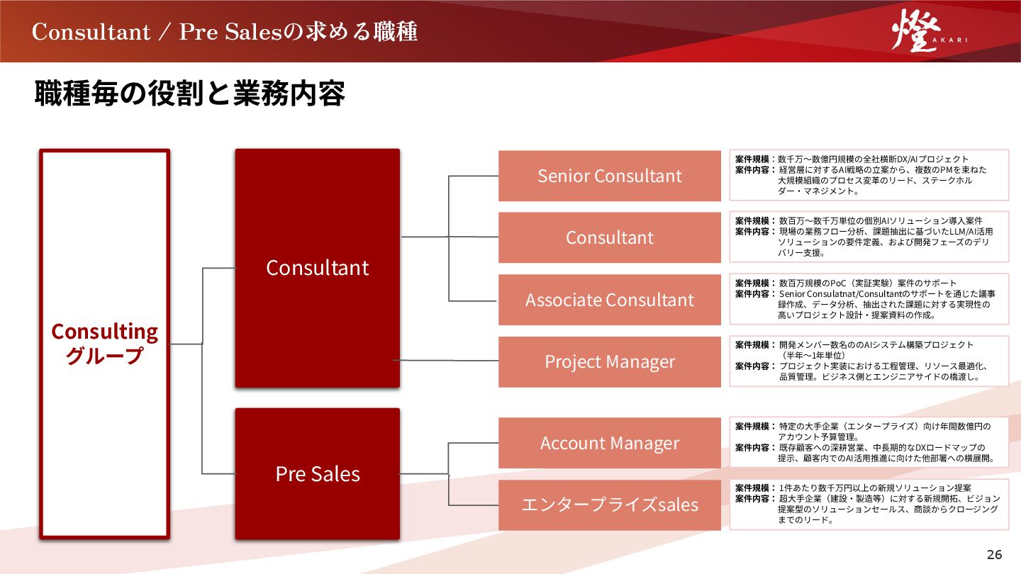 Sales Senior Consultant Consultant Associate Consultant Project Manager 案件規模:数千万〜数億円規模の全社横断DX/AIプロジェクト 案件内容: 経営層に対するAI戦略の⽴案から、複数のPMを束ねた      ⼤規模組織のプロセス変⾰のリード、ステークホル      ダー‧マネジメント。 案件規模: 数百万〜数千万単位の個別AIソリューション導⼊案件 案件内容: 現場の業務フロー分析、課題抽出に基づいたLLM/AI活⽤      ソリューションの要件定義、および開発フェーズのデリ      バリー⽀援。 案件規模: 数百万規模のPoC(実証実験)案件のサポート 案件内容: Senior Consulatnat/Consultantのサポートを通じた議事      録作成、データ分析、抽出された課題に対する実現性の      ⾼いプロジェクト設計‧提案資料の作成。 案件規模: 開発メンバー数名ののAIシステム構築プロジェクト      (半年〜1年単位) 案件内容: プロジェクト実装における⼯程管理、リソース最適化、       品質管理。ビジネス側とエンジニアサイドの橋渡し。 Account Manager エンタープライズsales 案件規模: 特定の⼤⼿企業(エンタープライズ)向け年間数億円の      アカウント予算管理。 案件内容: 既存顧客への深耕営業、中⻑期的なDXロードマップの      提⽰、顧客内でのAI活⽤推進に向けた他部署への横展開。 案件規模: 1件あたり数千万円以上の新規ソリューション提案 案件内容: 超⼤⼿企業(建設‧製造等)に対する新規開拓、ビジョン      提案型のソリューションセールス、商談からクロージング      までのリード。