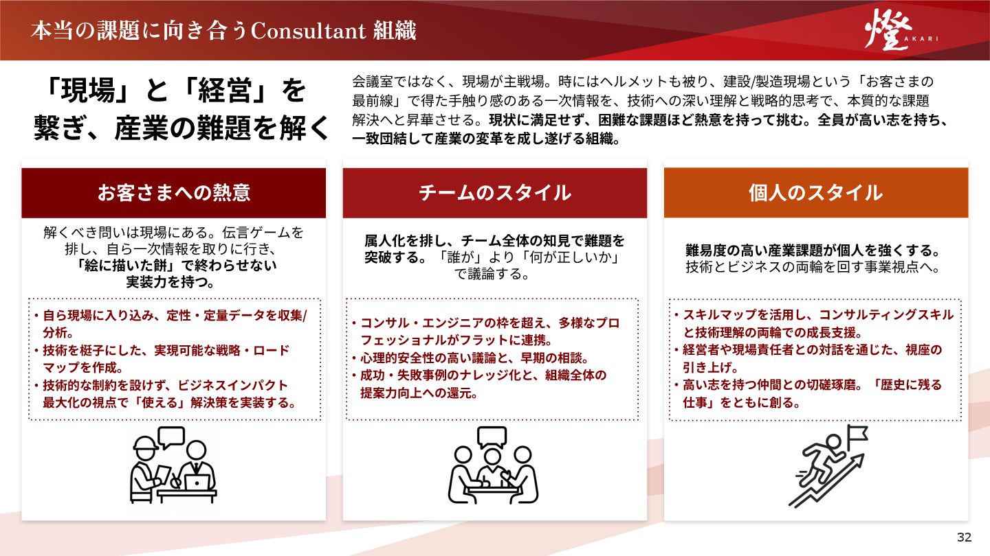 排し、⾃ら⼀次情報を取りに⾏き、 「絵に描いた餅」で終わらせない 実装⼒を持つ。 ‧⾃ら現場に⼊り込み、定性‧定量データを収集/  分析。 ‧技術を梃⼦にした、実現可能な戦略‧ロード  マップを作成。 ‧技術的な制約を設けず、ビジネスインパクト  最⼤化の視点で「使える」解決策を実装する。 チームのスタイル 属⼈化を排し、チーム全体の知⾒で難題を 突破する。「誰が」より「何が正しいか」 で議論する。 個⼈のスタイル 難易度の⾼い産業課題が個⼈を強くする。 技術とビジネスの両輪を回す事業視点へ。 32 ‧コンサル‧エンジニアの枠を超え、多様なプロ  フェッショナルがフラットに連携。 ‧⼼理的安全性の⾼い議論と、早期の相談。 ‧成功‧失敗事例のナレッジ化と、組織全体の  提案⼒向上への還元。 ‧スキルマップを活⽤し、コンサルティングスキル  と技術理解の両輪での成⻑⽀援。 ‧経営者や現場責任者との対話を通じた、視座の  引き上げ。 ‧⾼い志を持つ仲間との切磋琢磨。「歴史に残る  仕事」をともに創る。