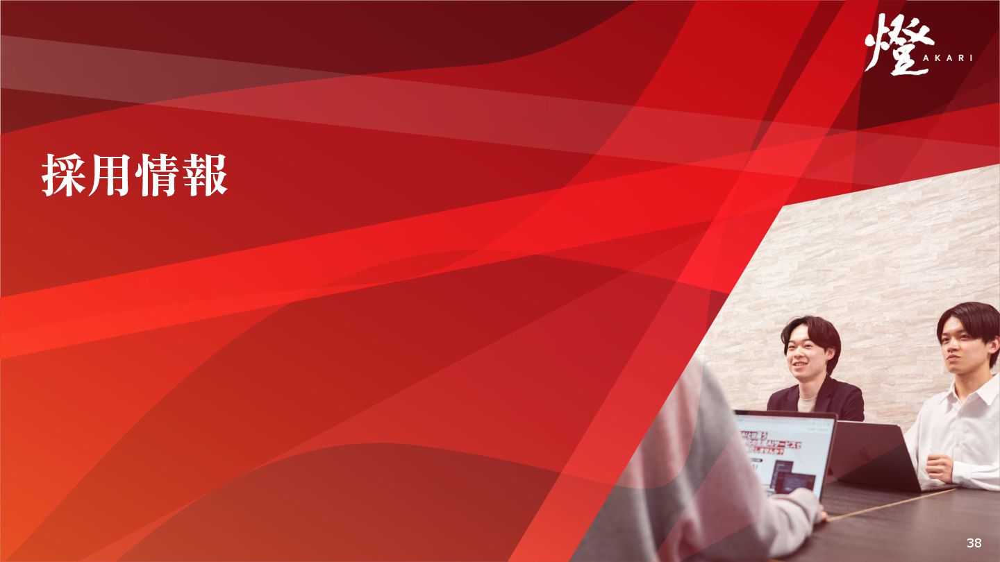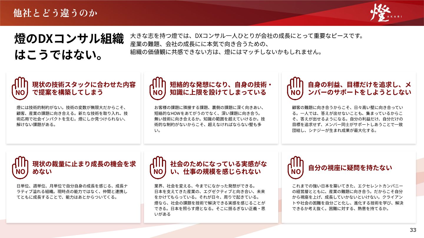 産業の難題、会社の成⻑にに本気で向き合うための、 組織の価値観に共感できない⽅は、燈にはマッチしないかもしれません。 現状の技術スタックに合わせた内容 で提案を構築してしまう 燈には技術的制約がない。技術の変数が無限⼤だからこそ、 顧客、産業の課題に向き合える。新たな技術を取り⼊れ、技 術応⽤で社会インパクトを⽣む。燈にしか⾒つけられない、 解けない課題がある。 NO 社会のためになっている実感がな い、仕事の規模を感じられない 業界、社会を変える、今までになかった発想ができる。 ⽇本を⽀えてきた産業の、エグゼクティブと向き合い、未来 をかけてもらっている。それが⽇々、周りで起きている。 燈なら、社会の課題を技術で解決できる実感を感じることが できる。⽇本を照らす燈となる。そこに揺るぎない正義‧思 いがある NO 短絡的な発想になり、⾃⾝の技術‧ 知識に上限を設けてしまっている お客様の課題に隣接する課題、裏側の課題に深く向きあい、 短絡的なHOWをあてがうのでなく、深い課題に向き合う。 無い技術に向き合えるか。知識の範囲を超えていけるか。技 術的な制約がないからこそ、超えなければならない壁も多 い。 NO ⾃分の視座に疑問を持たない これまでの強い⽇本を築いてきた、エクセレントカンパニー の経営層とともに、産業の難題に向き合う。だからこそ⾃分 から視座を上げ、成⻑していかないといけない。クライアン トや社会の困難を⾃分ごと化し、進化する技術を学び、解決 できるか考え抜く。困難に対する、熱意を持てるか。 NO ⾃⾝の利益、⽬標だけを追求し、メ ンバーのサポートをしようとしない 顧客の難題に向き合うからこそ、⽇々⾼い壁に向き合ってい る。⼀⼈では、答えが出せないことも、集まっているからこ そ、答えが出せるようになる。⾃分の利益だけ、⾃分だけの ⽬標を追求せず、メンバー同⼠がサポートしあうことで⼀致 団結し、シナジーが⽣まれ成果が最⼤化する。 NO 33