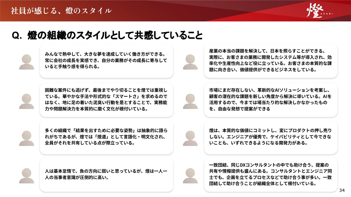 多くの組織で「結果を出すために必要な姿勢」は抽象的に語ら れがちであるが、燈では「燈道」として⾔語化‧明⽂化され、 全員がそれを共有している点が際⽴っている。 産業の本当の課題を解決して、⽇本を照らすことができる。 実際に、お客さまの業務に開発したシステム等が導⼊され、効 率化や⽣産性向上など役に⽴っている。お客さまの本質的な課 題に向き合い、価値提供ができるビジネスをしている。 市場にまだ存在しない、⾰新的なAIソリューションを考案し、 顧客の潜在的な課題を新しい⾓度から解決に導いている。AIを 活⽤するので、今までは場当たり的な解決しかなかったもの を、⾃由な発想で提案ができる 燈は、本質的な価値にコミットし、変にプロダクトの押し売り しない。エンジニアが優秀で、ケイパビリティとして今できな いことも、いずれできるようになる開発⼒がある。 ⼈は基本怠惰で、負の⽅向に弱いと思っているが、燈は⼀⼈⼀ ⼈の当事者意識が圧倒的に⾼い。 ⼀致団結、同じDXコンサルタントの中でも助け合う、提案の 共有や情報提供も盛んにある。コンサルタントとエンジニア同 ⼠でも、企画を⽴てるプロセスなどで助け合う事が多い。⼀致 団結して助け合うことが組織全体として根付いている。 34
