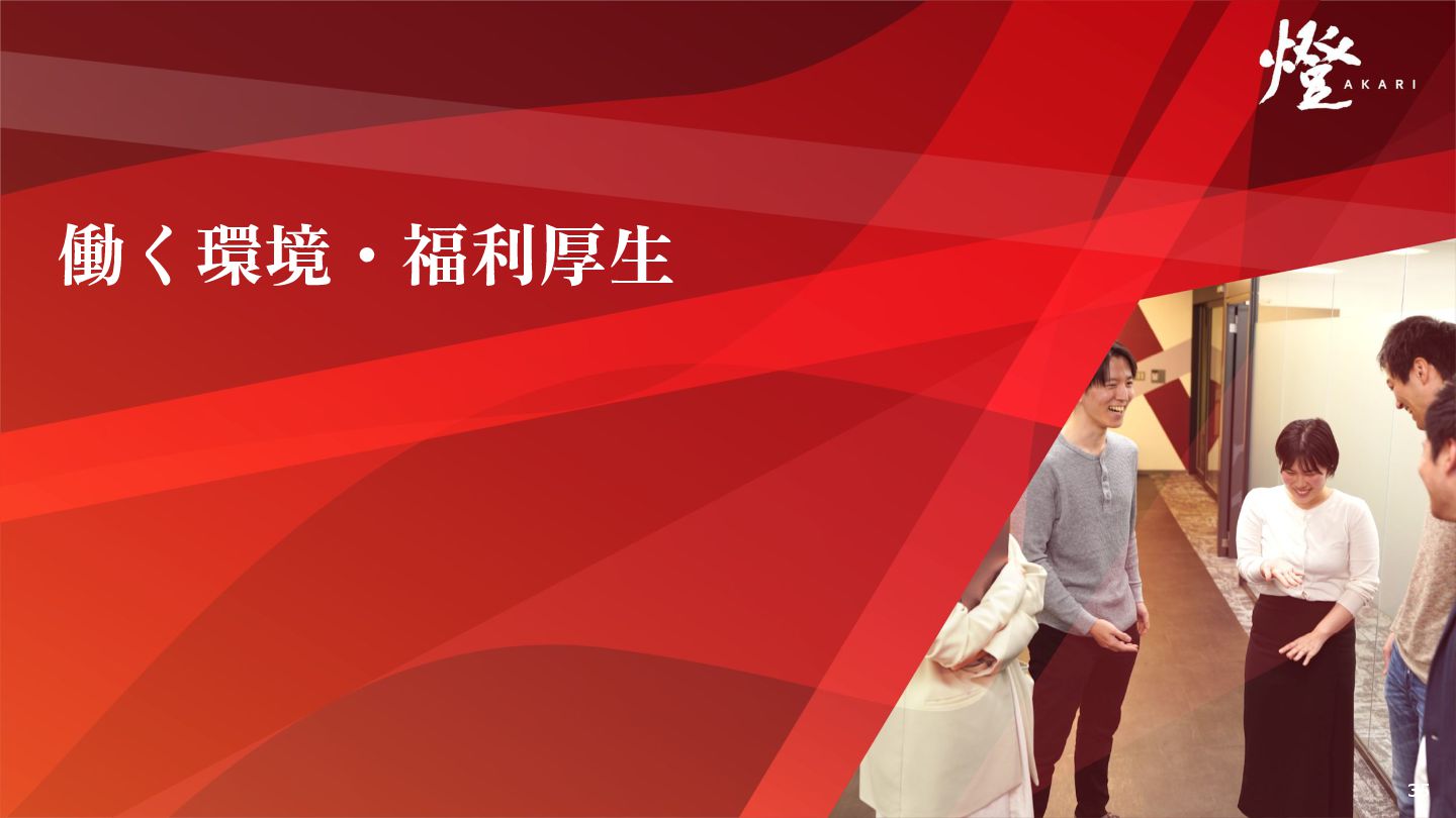 ます。 締め会  四半期末に全社員で集まり、各四半期の成果や成功事 例を共有し、表彰式も開催されます。 各四半期の努⼒を称え合い、次の四半期へのモチベー ションを⾼めます。 全社総会 年末に全社員がホテルなどの会場に集まり、1年間の成 果を共有する全社総会を開催します。年間の事業の振 り返り、表彰式の開催などを通じて、1年間の努⼒を称 え合い、新たな年へのモチベーションを⾼めます。 ⼣会 毎⽇19時に全社員で集合し、選ばれた1名がその⽇の 燈道を実践したエピソードを共有した後、全社員で燈 道を唱和します。1⽇の締めに全員で顔を合わせ、⽇々 の結束⼒が深まります。 シャッフルランチ 毎週⽉曜⽇の昼に朝会で⼀緒の班になった社員同⼠で ランチに⾏きます。部署に関わらず、交流を深めるこ とができます。最近は⼈数も増えて近隣レストランに 複数班の燈メンバーが⼀緒になることも。 完全出社制 毎⽇10~19時の完全出社制を採⽤しています。 社員同⼠が顔を合わせてコミュニケーションする機会 を最⼤化し、「⼀致団結」に寄与しています。 ※⽇ごとに事情に応じてリモート勤務や時間給の取得 なども可能です 36