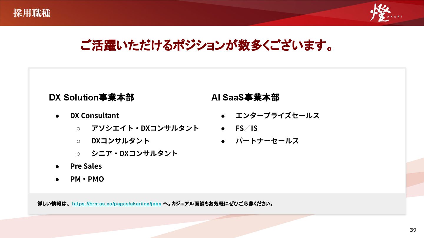 21. 採用職種 ご活躍いただけるポジションが数多くございます。 詳しい情報は、 https://hrmos.co/pages/akariinc/jobs へ。カジュアル面談もお気軽にぜひご応募ください。 DX Solution事業本部 • DX Consultant