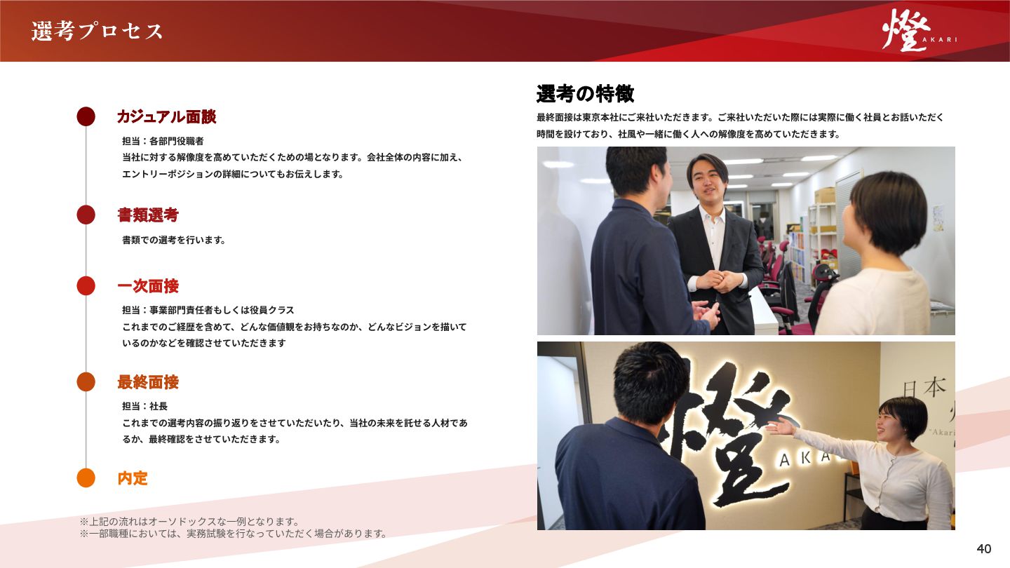 担当:社⻑ これまでの選考内容の振り返りをさせていただいたり、当社の未来を託せる⼈材であ るか、最終確認をさせていただきます。 書類選考 ※上記の流れはオーソドックスな⼀例となります。 ※⼀部職種においては、実務試験を⾏なっていただく場合があります。 内定 書類での選考を⾏います。 選考の特徴 最終⾯接は東京本社にご来社いただきます。ご来社いただいた際には実際に働く社員とお話いただく 時間を設けており、社⾵や⼀緒に働く⼈への解像度を⾼めていただきます。 40