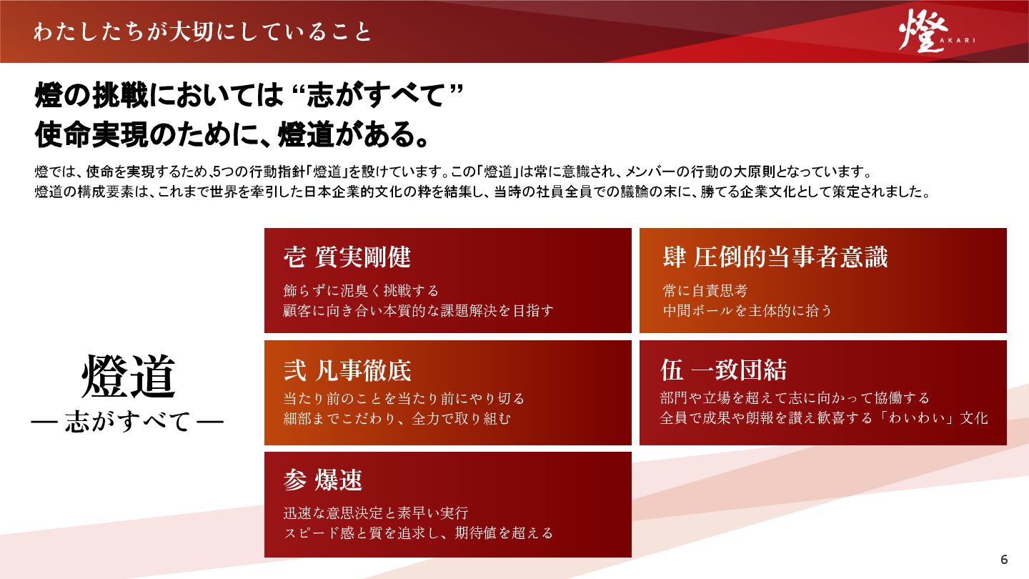 飾らずに泥臭く挑戦する 顧客に向き合い本質的な課題解決を目指す 常に自責思考 中間ボールを主体的に拾う 当たり前のことを当たり前にやり切る 細部までこだわり、全力で取り組む 部門や立場を超えて志に向かって協働する 全員で成果や朗報を讃え歓喜する「わいわい」文化 迅速な意思決定と素早い実行 スピード感と質を追求し、期待値を超える 燈道 志がすべて 燈の挑戦においては “志がすべて ” 使命実現のために、燈道がある。 燈では、使命を実現するため、 5つの行動指針「燈道」を設けています。この「燈道」は常に意識され、メンバーの行動の大原則となっています。 燈道の構成要素は、これまで世界を牽引した日本企業的文化の粋を結集し、当時の社員全員での議論の末に、勝てる企業文化として策定されました。 わたしたちが大切にしていること 6