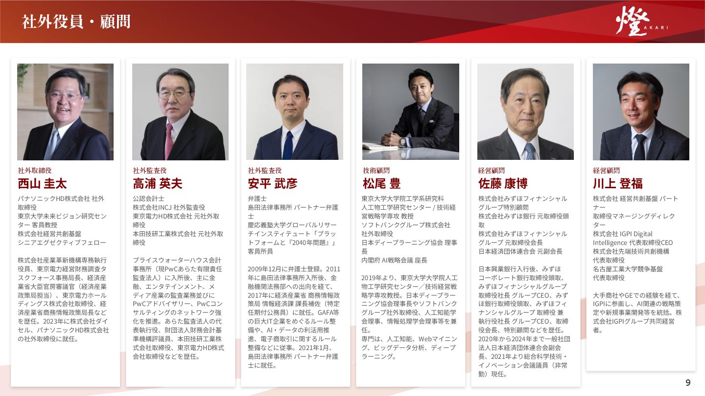 株式会社経営共創基盤 シニアエグゼクティブフェロー 株式会社産業⾰新機構専務執⾏ 役員、東京電⼒経営財務調査タ スクフォース事務局⻑、経済産 業省⼤⾂官房審議官(経済産業 政策局担当)、東京電⼒ホール ディングス株式会社取締役、経 済産業省商務情報政策局⻑など を歴任。2023年に株式会社ダイ セル、パナソニックHD株式会社 の社外取締役に就任。 社外監査役 ⾼浦 英夫 公認会計⼠ 株式会社INCJ 社外監査役 東京電⼒HD株式会社 元社外取 締役 本⽥技研⼯業株式会社 元社外取 締役 プライスウォーターハウス会計 事務所(現PwCあらた有限責任 監査法⼈)に⼊所後、主に⾦ 融、エンタテインメント、メ ディア産業の監査業務並びに PwCアドバイザリー、PwCコン サルティングのネットワーク強 化を推進。あらた監査法⼈の代 表執⾏役、財団法⼈財務会計基 準機構評議員、本⽥技研⼯業株 式会社取締役、東京電⼒HD株式 会社取締役などを歴任。 社外監査役 安平 武彦 弁護⼠ 島⽥法律事務所 パートナー弁護 ⼠ 慶応義塾⼤学グローバルリサー チインスティテュート「プラッ トフォームと『2040年問題』」 客員所員 2009年12⽉に弁護⼠登録。2011 年に島⽥法律事務所⼊所後、⾦ 融機関法務部への出向を経て、 2017年に経済産業省 商務情報政 策局 情報経済課 課⻑補佐(特定 任期付公務員)に就任。GAFA等 の巨⼤IT企業をめぐるルール整 備や、AI‧データの利活⽤推 進、電⼦商取引に関するルール 整備などに従事。2021年1⽉、 島⽥法律事務所 パートナー弁護 ⼠に就任。 技術顧問 松尾 豊 東京⼤学⼤学院⼯学系研究科 ⼈⼯物⼯学研究センター / 技術経 営戦略学専攻 教授 ソフトバンクグループ株式会社 社外取締役 ⽇本ディープラーニング協会 理事 ⻑ 内閣府 AI戦略会議 座⻑ 2019年より、東京⼤学⼤学院⼈⼯ 物⼯学研究センター∕技術経営戦 略学専攻教授。⽇本ディープラー ニング協会理事⻑やソフトバンク グループ社外取締役、⼈⼯知能学 会理事、情報処理学会理事等を兼 任。 専⾨は、⼈⼯知能、Webマイニン グ、ビッグデータ分析、ディープ ラーニング。 経営顧問 経営顧問 株式会社みずほフィナンシャル グループ特別顧問 株式会社みずほ銀⾏ 元取締役頭 取 株式会社みずほフィナンシャル グループ 元取締役会⻑ ⽇本経済団体連合会 元副会⻑ ⽇本興業銀⾏⼊⾏後、みずほ コーポレート銀⾏取締役頭取、 みずほフィナンシャルグループ 取締役社⻑ グループCEO、みず ほ銀⾏取締役頭取、みずほフィ ナンシャルグループ 取締役 兼 執⾏役社⻑ グループCEO、取締 役会⻑、特別顧問などを歴任。 2020年から2024年まで⼀般社団 法⼈⽇本経済団体連合会副会 ⻑、2021年より総合科学技術‧ イノベーション会議議員(⾮常 勤)現任。 佐藤 康博 川上 登福 株式会社 経営共創基盤 パート ナー 取締役マネージングディレク ター 株式会社 IGPI Digital Intelligence 代表取締役CEO 株式会社先端技術共創機構 代表取締役 名古屋⼯業⼤学競争基盤 代表取締役 ⼤⼿商社やGEでの経験を経て、 IGPIに参画し、AI関連の戦略策 定や新規事業開発等を統括。株 式会社IGPIグループ共同経営 者。 9