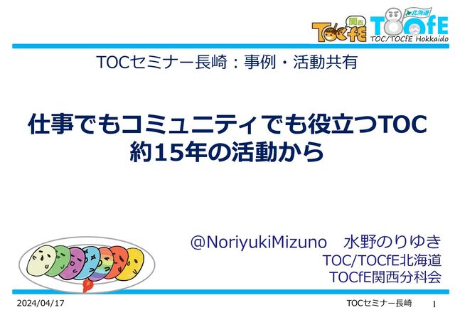 1 2024/04/17 TOCセミナー長崎 TOCセミナー長崎:事例・活動共有 仕事でもコミュニティでも役立つTOC 約15年の活動から @NoriyukiMizuno 水野のりゆき TOC/TOCfE北海道 TOCfE関西分科会