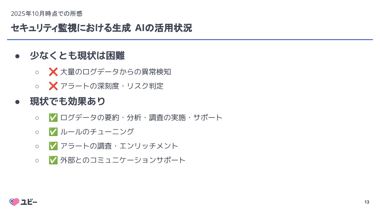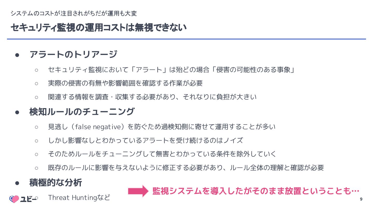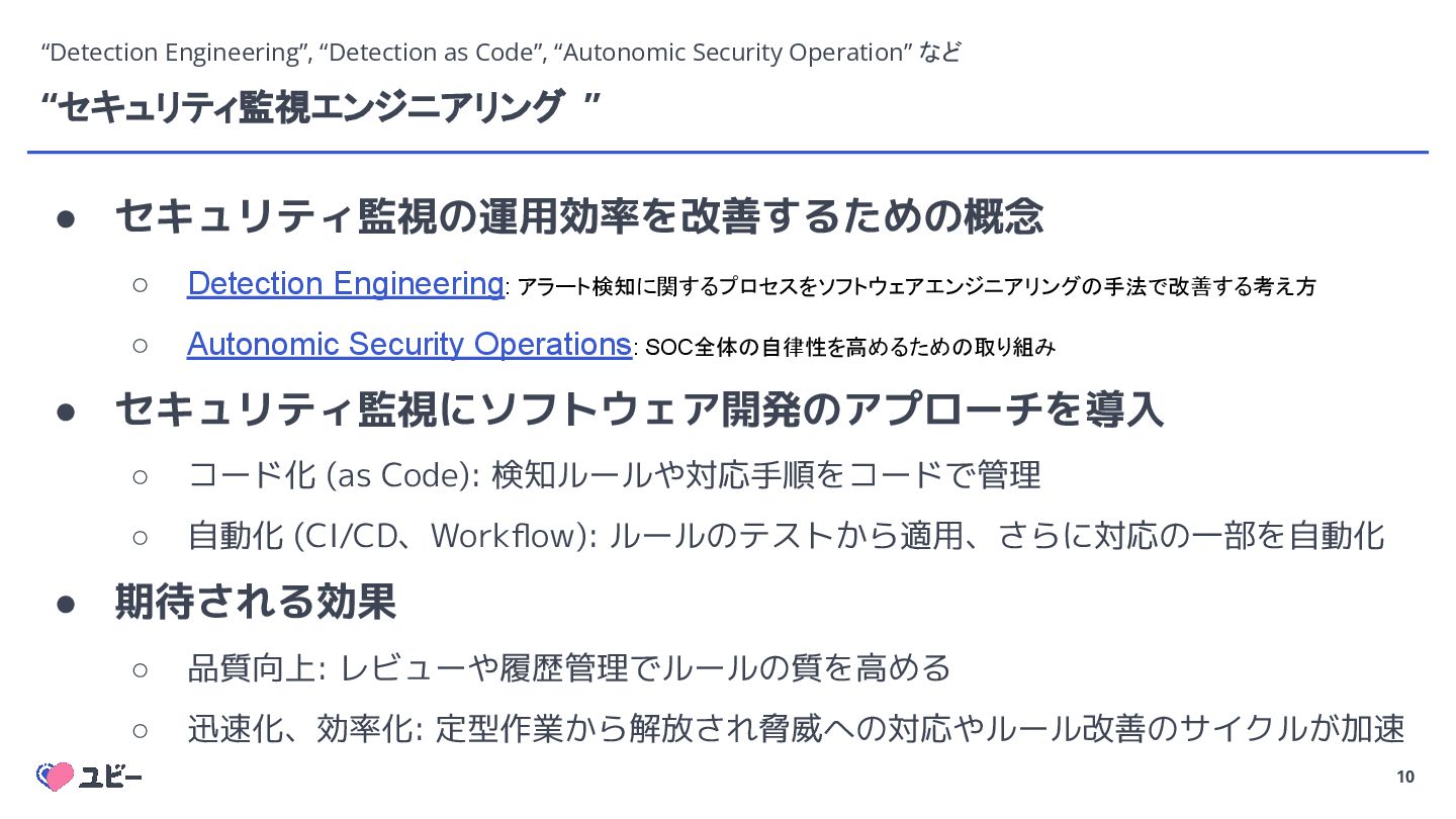 Operation” など • セキュリティ監視の運用効率を改善するための概念 ◦ Detection Engineering: アラート検知に関するプロセスをソフトウェアエンジニアリングの手法で改善する考え方 ◦ Autonomic Security Operations: SOC全体の自律性を高めるための取り組み • セキュリティ監視にソフトウェア開発のアプローチを導入 ◦ コード化 (as Code): 検知ルールや対応手順をコードで管理 ◦ 自動化 (CI/CD、Workflow): ルールのテストから適用、さらに対応の一部を自動化 • 期待される効果 ◦ 品質向上: レビューや履歴管理でルールの質を高める ◦ 迅速化、効率化: 定型作業から解放され脅威への対応やルール改善のサイクルが加速