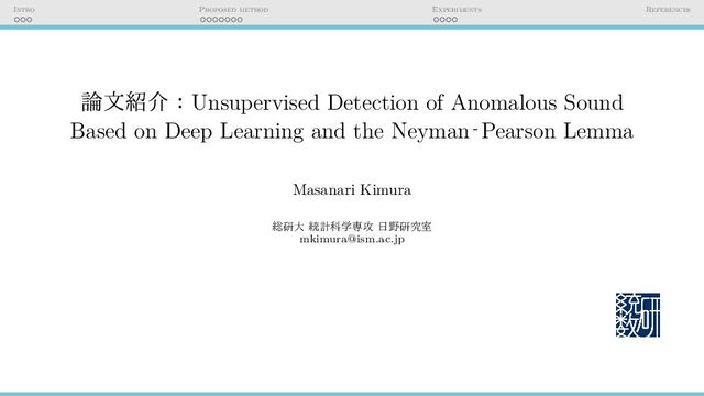 Based on the Neyman-Pearson Lemma 異常音は以下を満たす: p(x|Θ, y = 0) < exp (−ϕ). (1) このとき異常検知問題は以下の仮設検定の問題として扱うことができる: 帰無仮説 x は正常モデル p(x|Θ, y = 0) から生成されたサンプルである. Neyman-Pearson の補題から,最強力テストは特定の FPR を達成する可能なテストの中 で最大の検出力を持つ: maximize TPR(Θ, ϕ), s.t. FPR(Θ, ϕ) = ρ. (2) ここから,最適化対象の目的関数は J NP(Θ) = TPR(Θ, ϕ) − FPR(Θ, ϕ). (3) 8/16