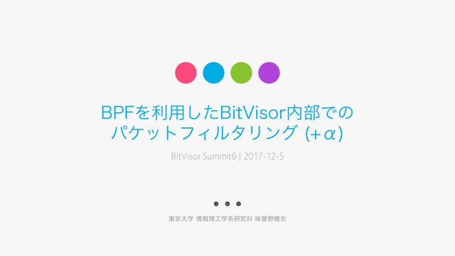 Level Stateful Filtering 対応OS 軽量さ (⇄複雑さ) nwfilter (KVM) Packet ◦ (conntrack) Linux ◦ SDN (Open vSwitch, VMWare NSX) Packet ◦ All △ VMI (VMwall1, xFilter2, AL-Safe3) Packet & Process ◦(?) Linux △ AWS Security Group Packet △ All ◦ BPF in BitVisor Packet △* (eBPF Mapを使う⽅法は考えられる) All ◎ [1] A. Srivastava and J. Giffin. Tamper-resistant, application-aware blocking of malicious network connections. In RAID, pages 39‒58. Springer, 2008. [2] K. Kourai, T. Azumi, and S. Chiba. Efficient and fine-grained vmm-level packet filtering for self-protection. IJARAS, 5(2):83‒100, Apr. 2014. [3] A. Giannakou, L. Rilling, J.-L. Pazat, and C. Morin. AL-SAFE: A secure self-adaptable application-level firewall for IaaS clouds. In CloudCom, pages 383‒390. IEEE, 2016. * TCPのACKフィールドを⾒るなどで⾃分から開始したコネクションを簡易的に判断することは可能