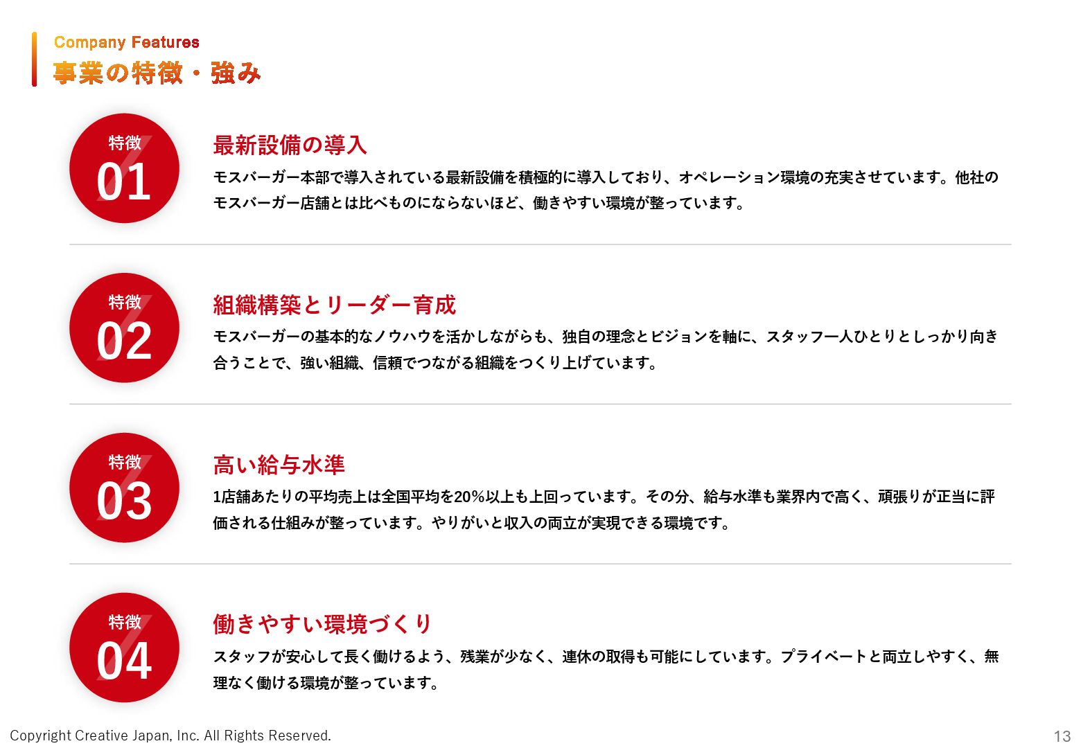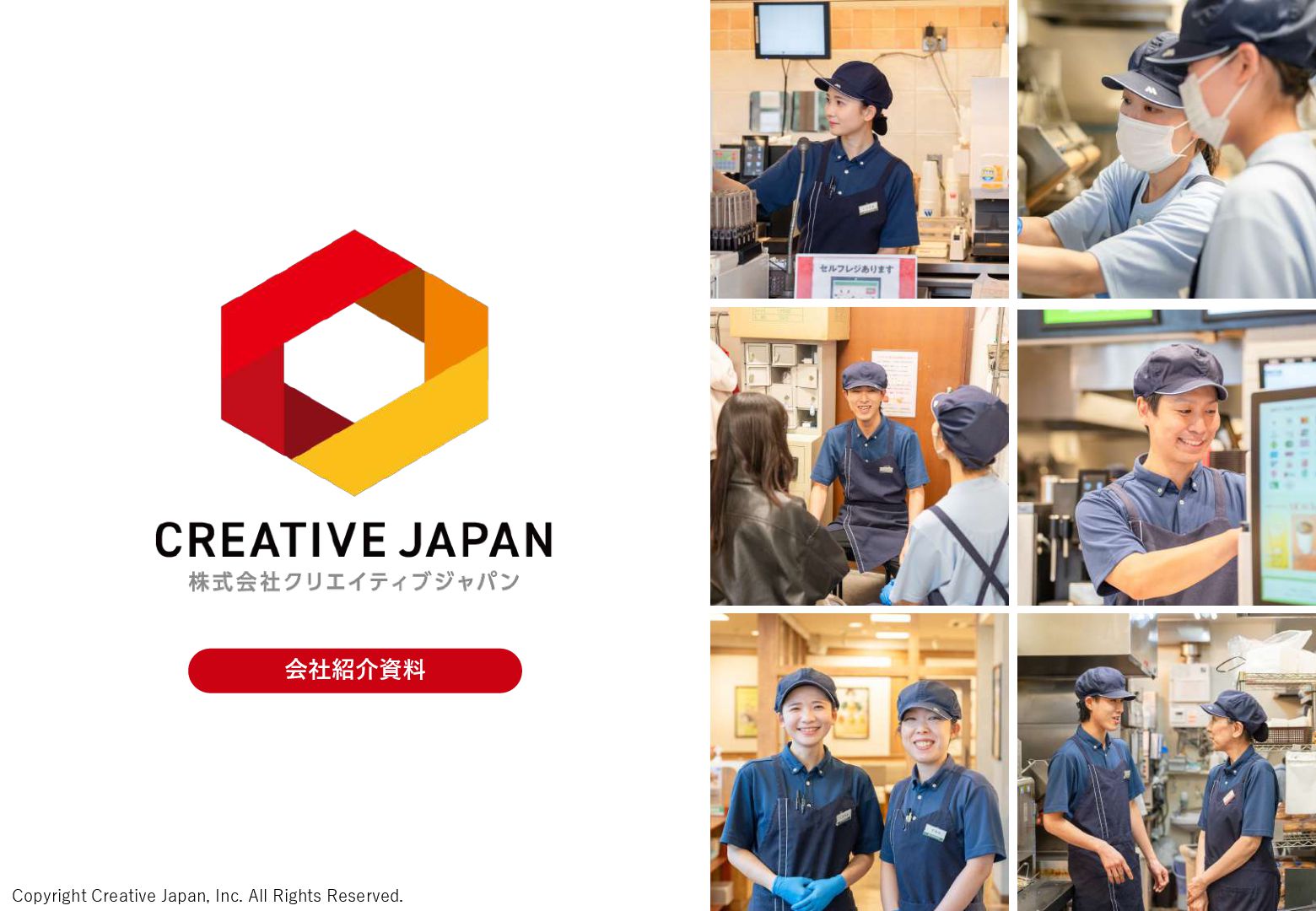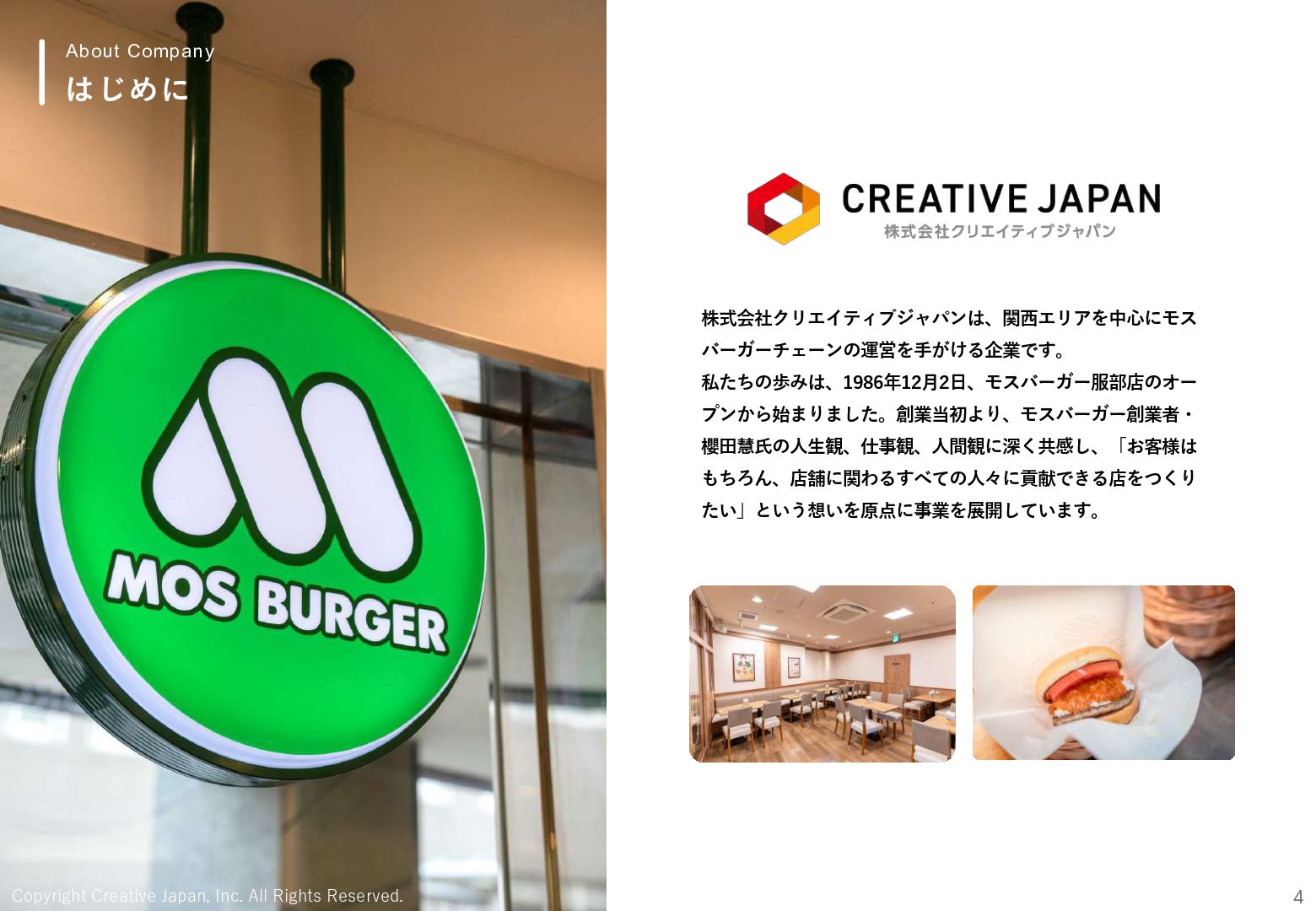 株式会社クリエイティブジャパンは、関⻄エリアを中⼼にモス バーガーチェーンの運営を⼿がける企業です。 私たちの歩みは、1986年12⽉2⽇、モスバーガー服部店のオー プンから始まりました。創業当初より、モスバーガー創業者・ 櫻⽥慧⽒の⼈⽣観、仕事観、⼈間観に深く共感し、「お客様は もちろん、店舗に関わるすべての⼈々に貢献できる店をつくり たい」という想いを原点に事業を展開しています。 4