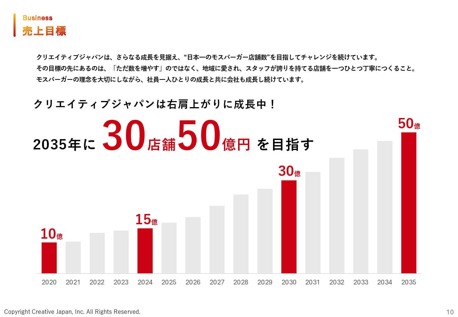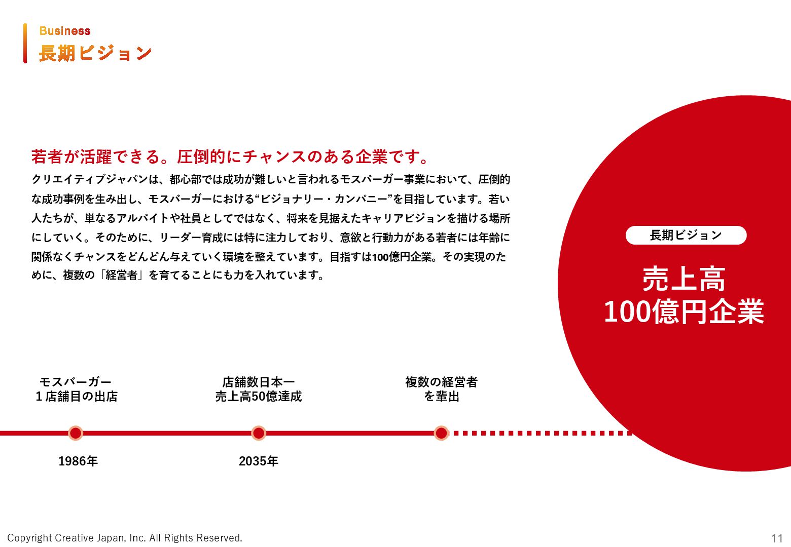 10. Copyright Creative Japan, Inc. All Rights Reserved. 若者が活躍できる。圧倒的にチャンスのある企業です。 クリエイティブジャパンは、都⼼部では成功が難しいと⾔われるモスバーガー事業において、圧倒的 な成功事例を⽣み出し、モスバーガーにおける“ビジョナリー・カンパニー”を⽬指しています。若い