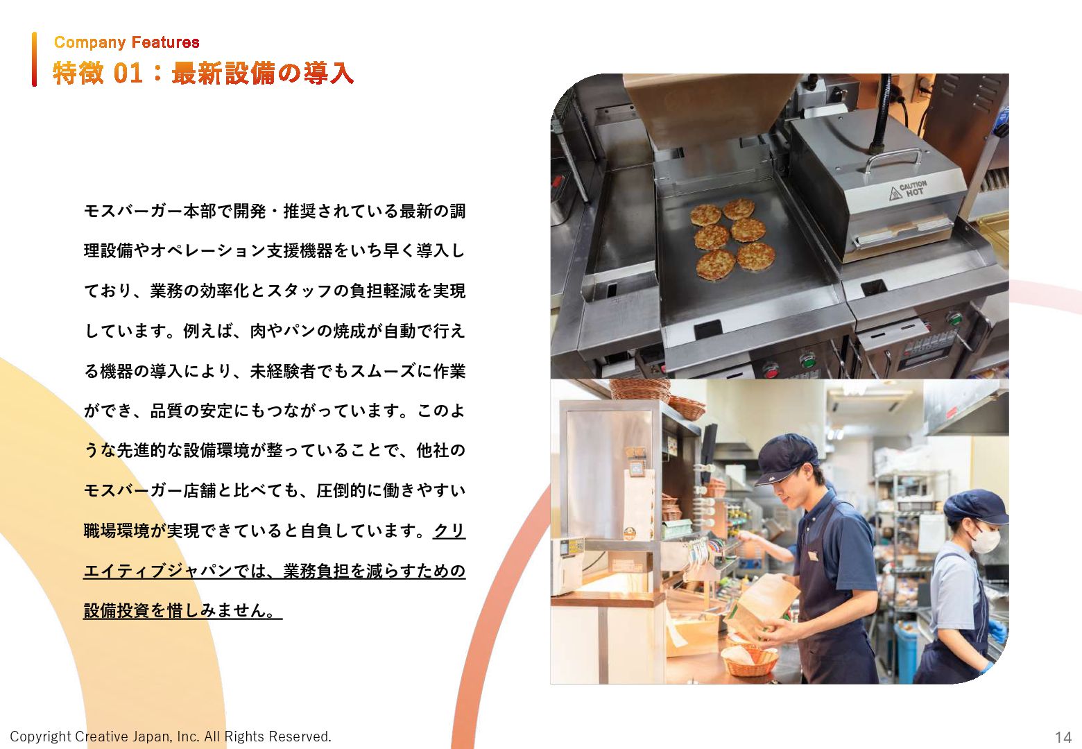 しています。例えば、⾁やパンの焼成が⾃動で⾏え る機器の導⼊により、未経験者でもスムーズに作業 ができ、品質の安定にもつながっています。このよ うな先進的な設備環境が整っていることで、他社の モスバーガー店舗と⽐べても、圧倒的に働きやすい 職場環境が実現できていると⾃負しています。クリ エイティブジャパンでは、業務負担を減らすための 設備投資を惜しみません。 14