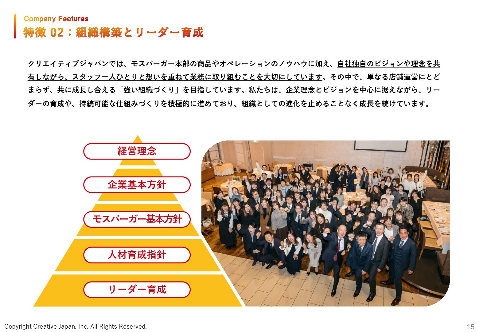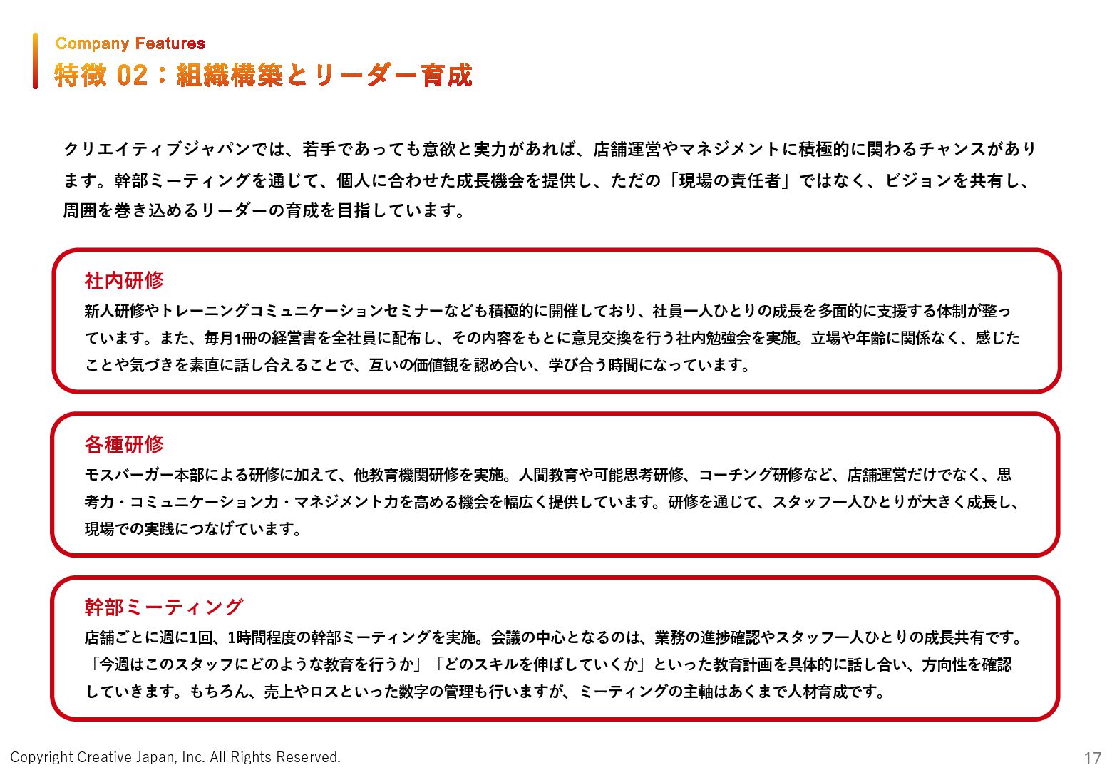 15. Copyright Creative Japan, Inc. All Rights Reserved. クリエイティブジャパンでは、若⼿であっても意欲と実⼒があれば、店舗運営やマネジメントに積極的に関わるチャンスがあり ます。幹部ミーティングを通じて、個⼈に合わせた成⻑機会を提供し、ただの「現場の責任者」ではなく、ビジョンを共有し、 周囲を巻き込めるリーダーの育成を⽬指しています。